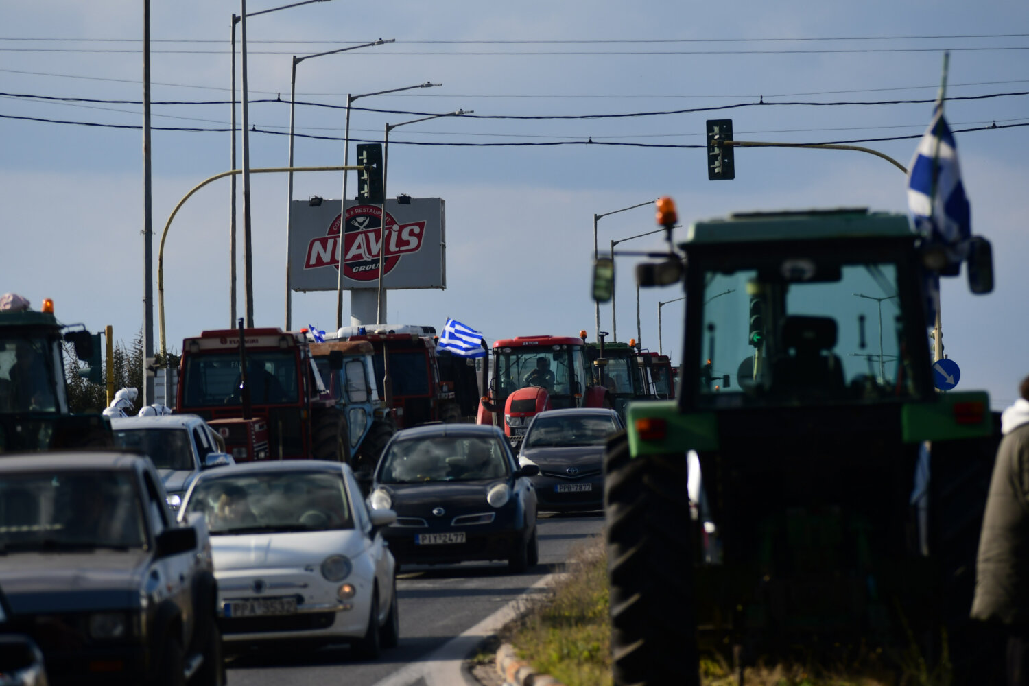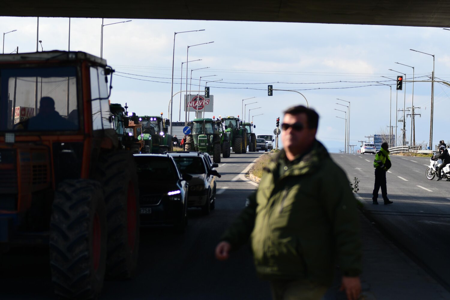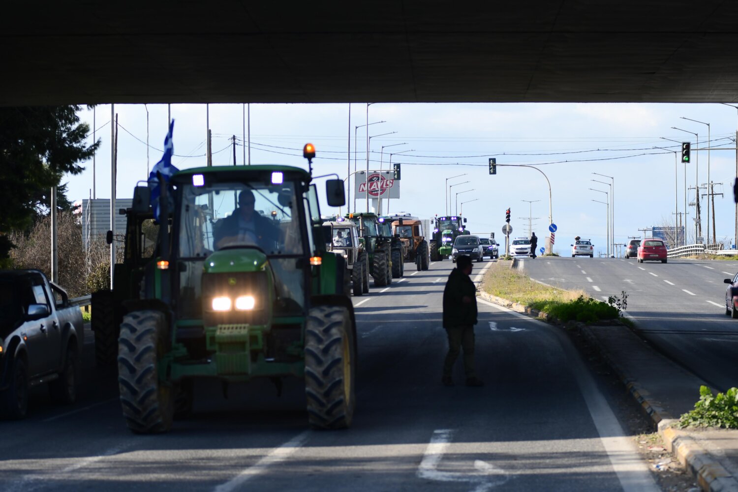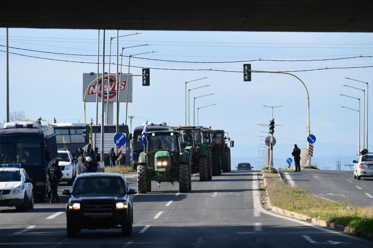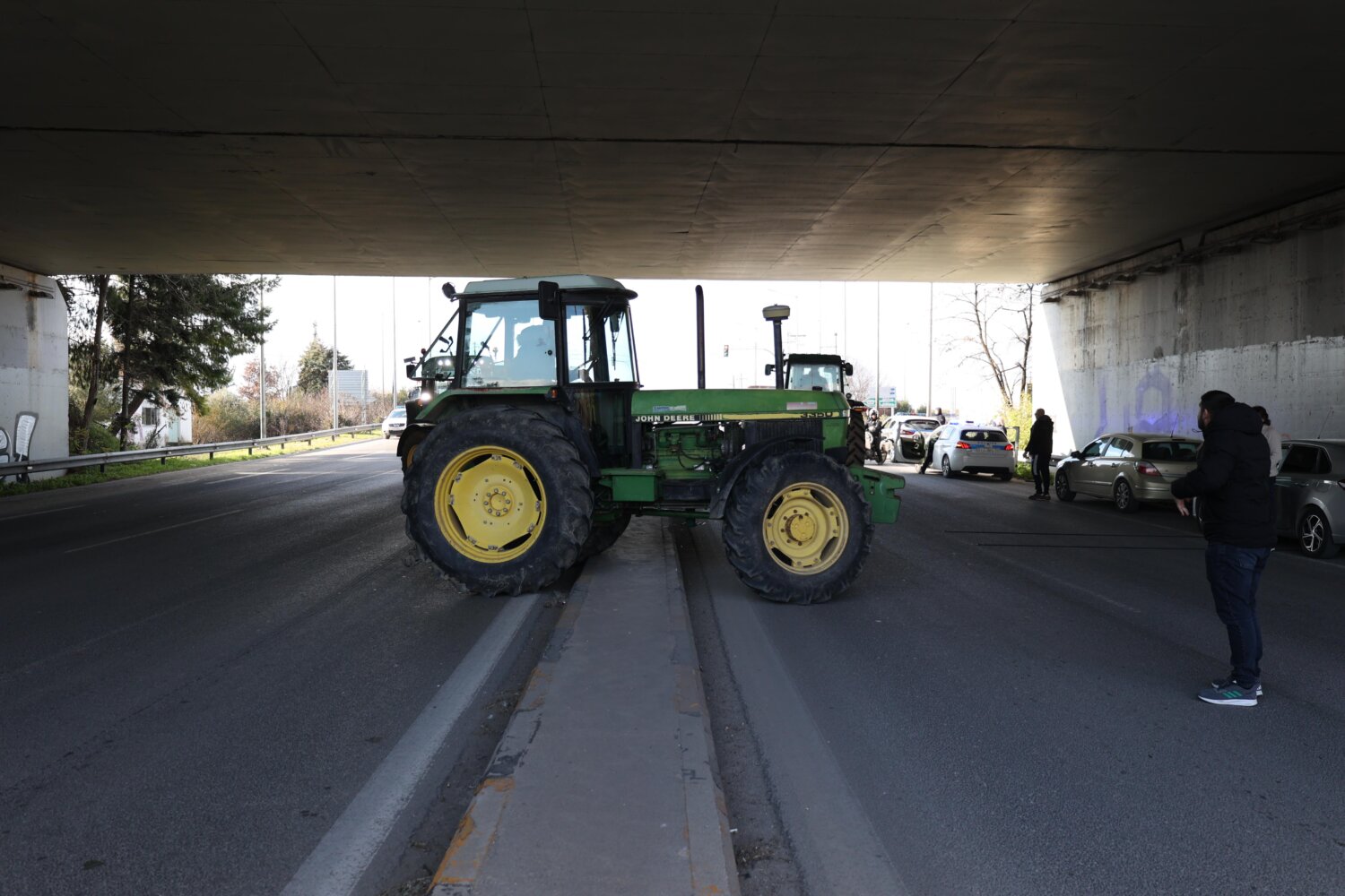 Τα τρακτέρ παρατάσσονται κάτω από την Εθνική Οδό, ενώ οι αστυνομικές δυνάμεις έχουν δημιουργήσει φραγμούς στις εξόδους ώστε να μην περάσουν.