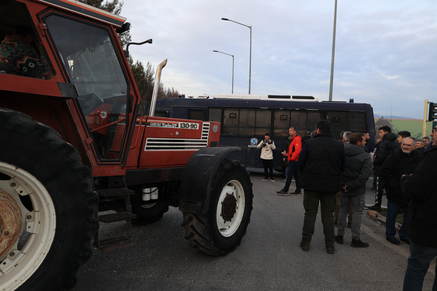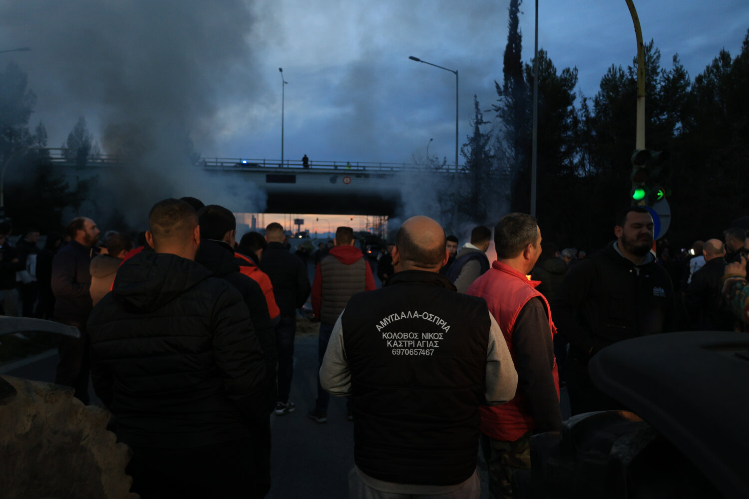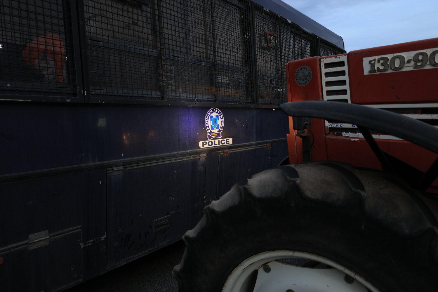 Σε αυτό το πλαίσιο επιχείρησαν να βγούνε με τα πόδια και με τρακτέρ στην εθνική οδό στο ύψος του Κόμβου του Πλατύκαμπου, ωστόσο εμποδίστηκαν από τον αστυνομικό φραγμό των ΜΑΤ με παρατεταγμένες κλούβες και διμοιρίες.