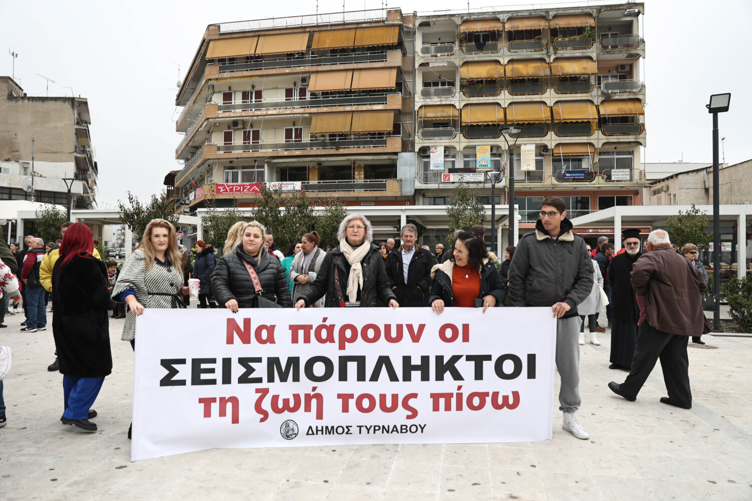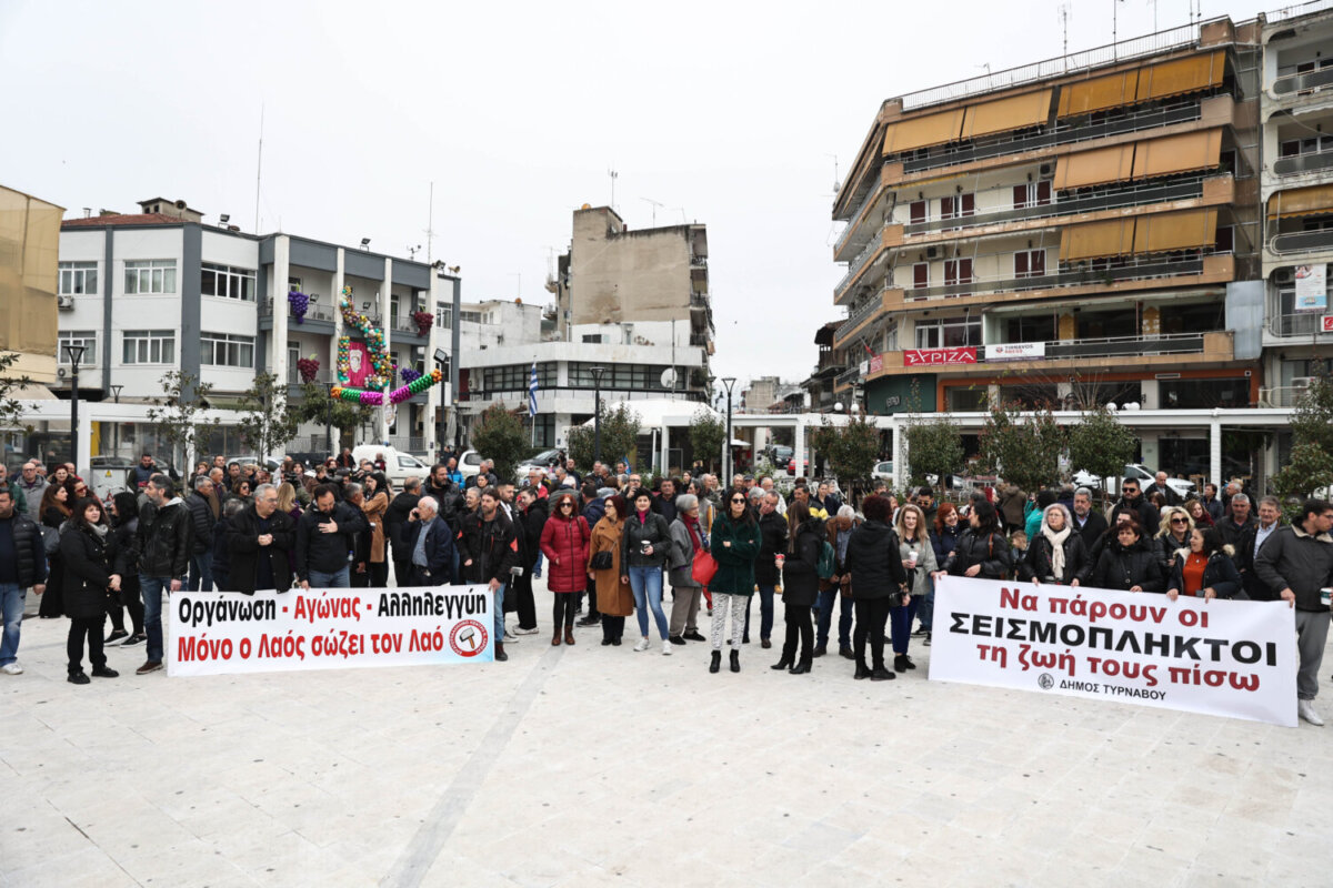 Νωρίς το μεσημέρι του Σαββάτου, στην πλατεία του Τυρνάβου πραγματοποιήθηκε συλλαλητήριο διαμαρτυρίας, όπου οι κάτοικοι φώναξαν, ψάχνοντας λύσεις για να καταφέρουν να μπουν στα σπίτια τους και να φύγουν από τα κοντέινερ.