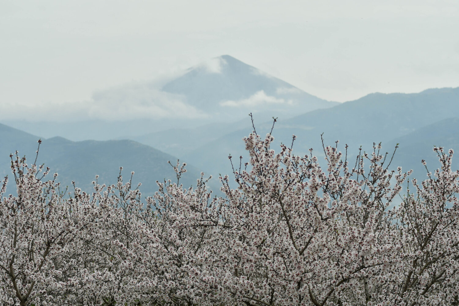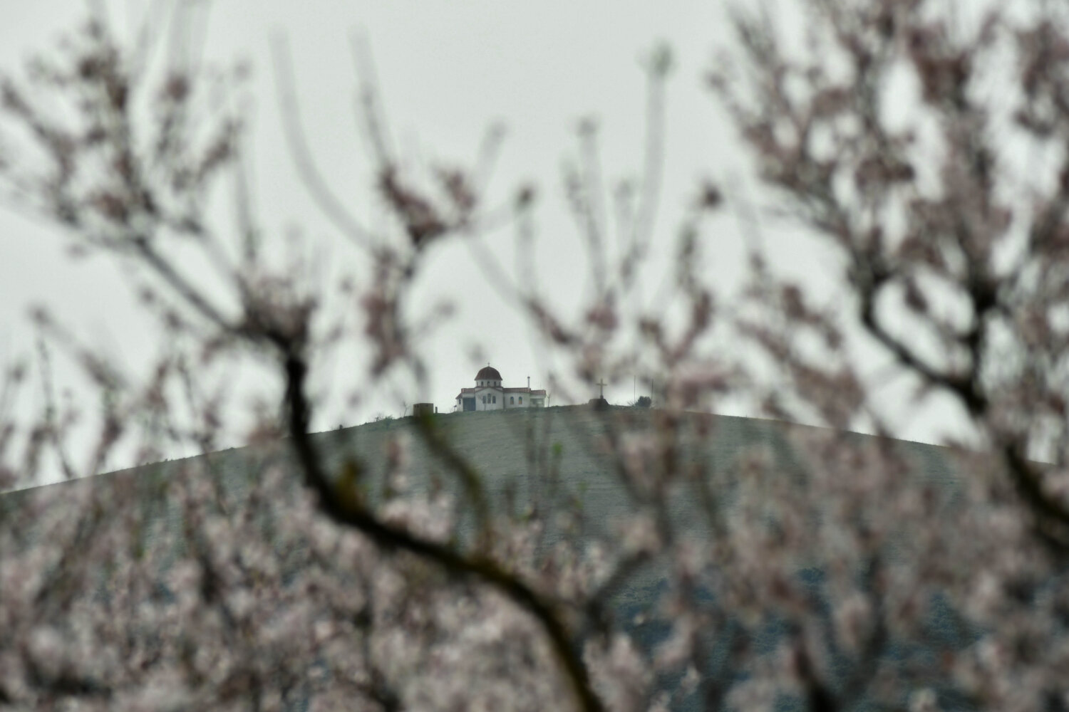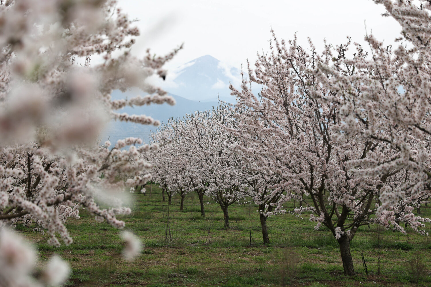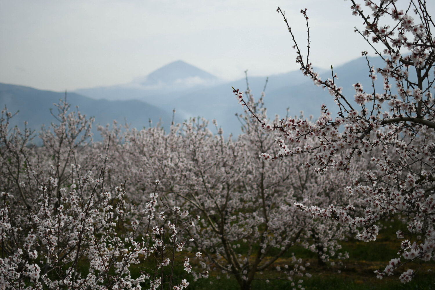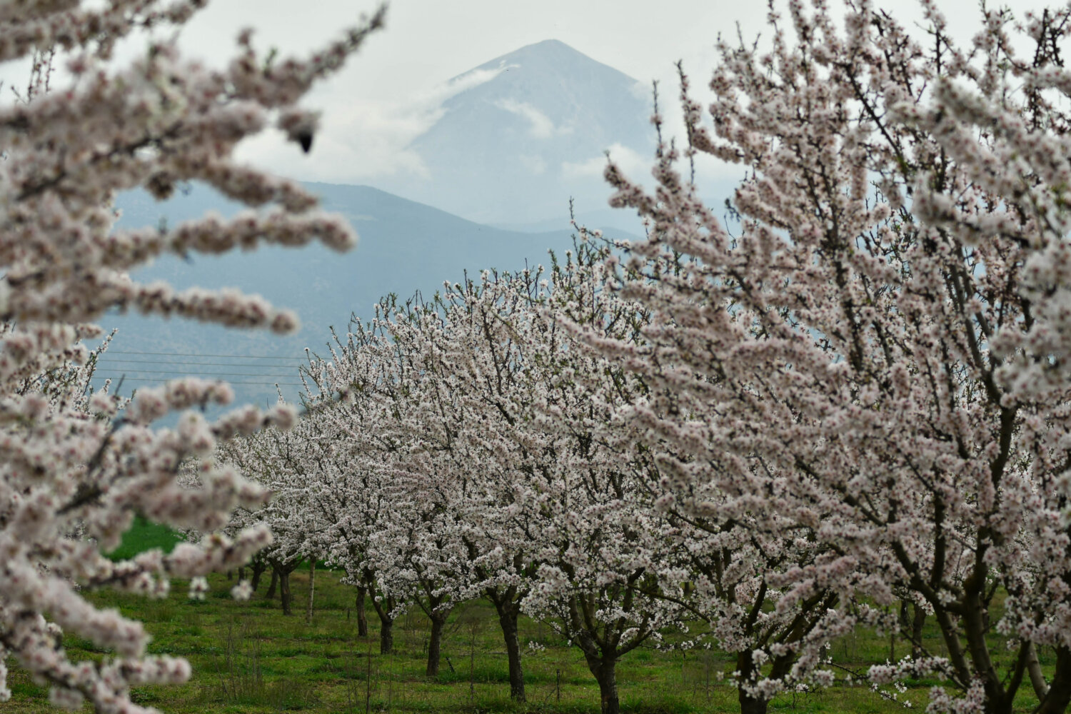 Οι «νύφες» – ανθισμένες αμυγδαλιές βρίσκονται στα ριζά του Κισσάβου και τα εναλλασσόμενα χρώματα λευκό, ροζ εναρμονίζονται με το πράσινο της φύσης σε έναν καμβά, έργο τέχνης της φύσης.