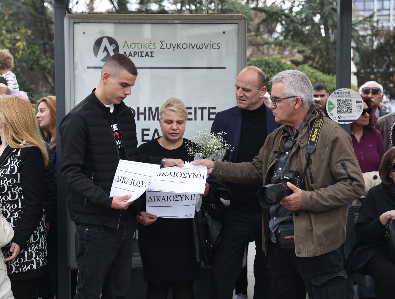 Μπροστά η Άλμα Λάτα – μητέρα της Κλαούντια – σιωπηλή, κρατά λίγα λουλούδια και ένα χαρτί με το μήνυμα που αποτελεί και αίτημα της ελληνικής κοινωνίας… «ΔΙΚΑΙΟΣΥΝΗ» για τα 57 αδικοχαμένα θύματα του εγκλήματος που ακόμα συγκλονίζει.