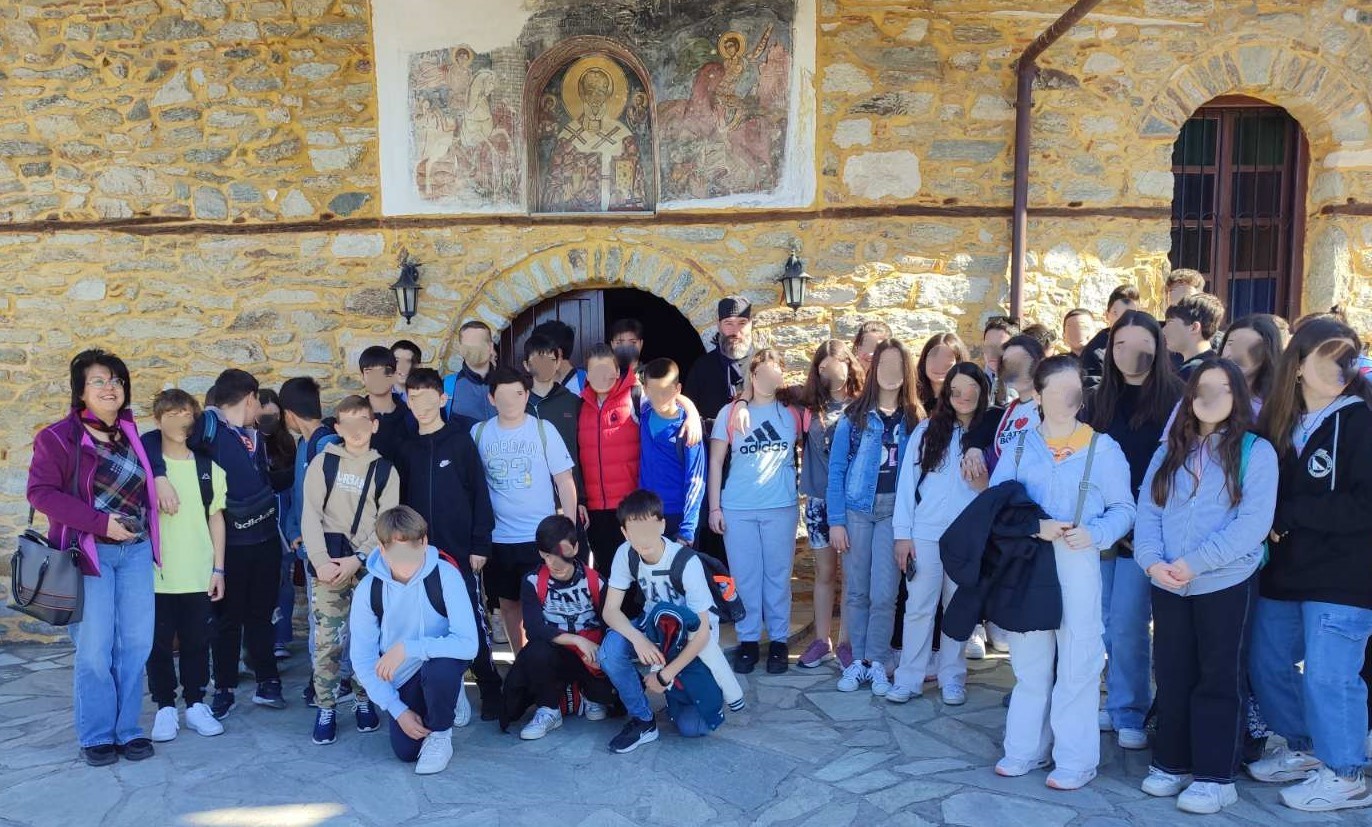 Οι μαθητές/τριες συναναστράφηκαν τους μαθητές/τριες της Οικονομείου Σχολής, που εκείνη την ώρα συμμετείχαν σε δράση για τη φιλοζωία. Θαύμασαν το πλούσιο υλικό που εκτίθεται εντός του ιστορικού κτιρίου και έπειτα φωτογράφισαν το επιβλητικό, αιωνόβιο κυπαρίσσι στο προαύλιο. Δίπλα στον παρακείμενο Ι. Ν. της Παναγίας οι μαθητές/τριες εντυπωσιάστηκαν από την «κρυψάνα», τη μεγάλη κρύπτη, όπου κατέφευγαν οι αγωνιστές ή έκρυβαν τα προϊόντα τους για προστασία από τη μανία των Τούρκων.