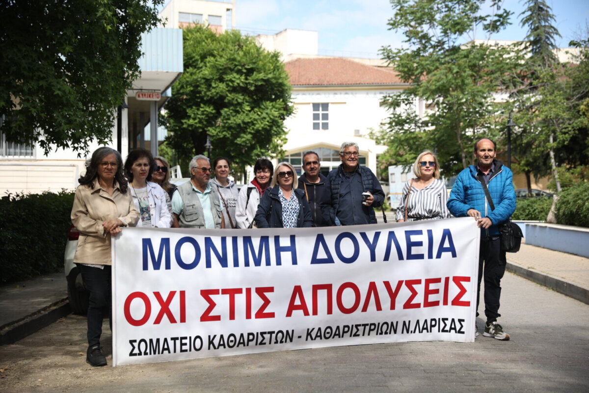 Παράσταση διαμαρτυρίας πραγματοποίησε το Εργατικό Κέντρο Λάρισας με τους πρώην εργαζόμενους συμβασιούχους στον τομέα της καθαριότητας του ΓΝΛ, το πρωί της Παρασκευής έξω από την είσοδο του νοσοκομείου.
