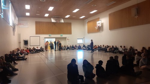 Τέλος, την τελευταία μέρα ιδιαίτερες και πολύ συγκινητικές, ήταν οι στιγμές που έζησε στο κλειστό γυμναστήριο του σχολείου, όπου συγκεντρώθηκαν οι μαθητές και οι μαθήτριες του σχολείου με τους εκπαιδευτικούς τους. Στην αρχή προβλήθηκαν βίντεο του σχολείου μας και της πόλης μας, που έχουν φτιάξει μαθητές/-τριές μας. Στη συνέχεια και μέσα σε μία ατμόσφαιρα ενθουσιασμού ο εκπαιδευτικός απέδωσε διάσημα τραγούδια του Μίκη Θεοδωράκη, συνοδευόμενος στο πιάνο από την καθηγήτρια Μουσικής του σχολείου δίνοντας τον ρυθμό στους μαθητές/-τριες οι οποίοι ακολουθούσαν μαζί του και ανταπέδωσαν με το ζωηρό χειροκρότημά τους.