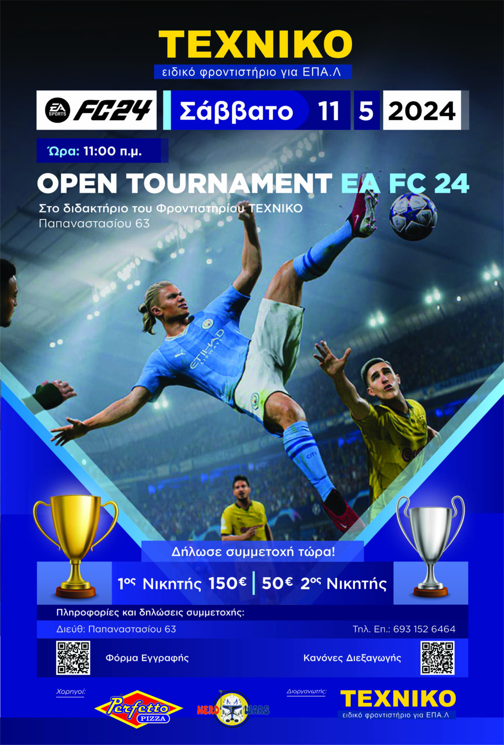 Tournament EA FC 24 θα διεξαχθεί στο Φροντιστήριο ΤΕΧΝΙΚΟ, το Σάββατο 11/5/2024 (έναρξη 11.00 π.μ.) με 1ο βραβείο 150€ και 2ο βραβείο 50€.