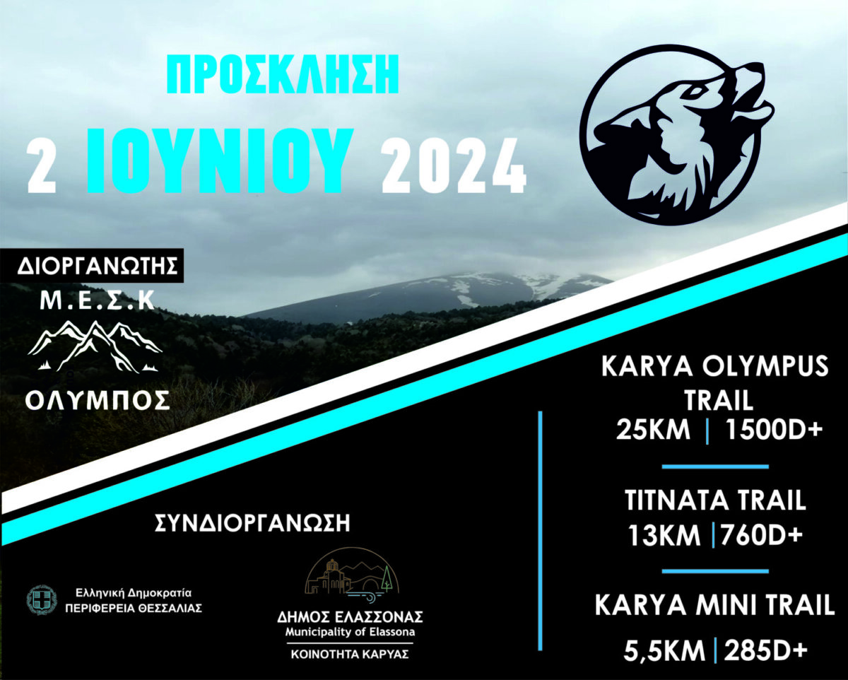 Ο ΜΕΣ Καρυάς «Όλυμπος» διοργανώνει την Κυριακή στις 2/6/2024 τον 4ο Ορεινό Αγώνα «KARYA OLYMPUS TRAIL» στην Καρυά του Δήμου Ελασσόνας με σκοπό την καλλιέργεια του αθλητικού πνεύματος και την ανάδειξη αυτής της ιδιαίτερα όμορφης περιοχής του θεσσαλικού Ολύμπου.