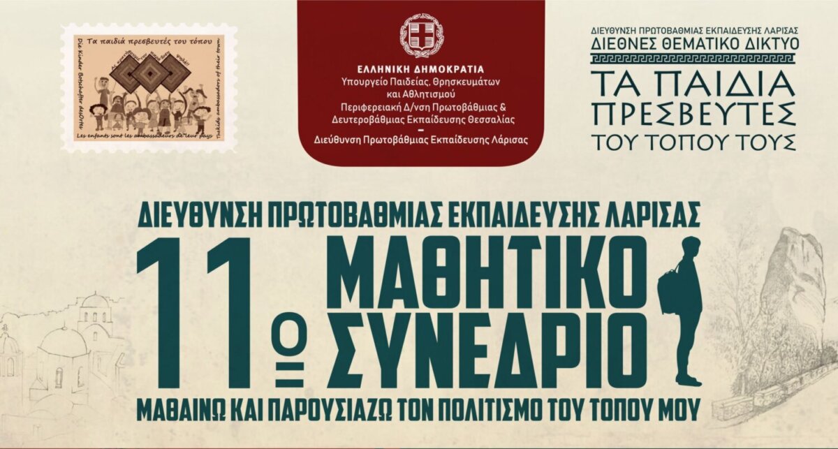 H Διεύθυνση Πρωτοβάθμιας Εκπαίδευσης Λάρισας, διοργανώνει το 11ο Μαθητικό Συνέδριο με τίτλο: «Μαθαίνω & Παρουσιάζω τον Πολιτισμό του τόπου μου», το οποίο θα πραγματοποιηθεί την Τετάρτη 29/5/2024 στην Αίθουσα Εκδηλώσεων της Δημοτικής Πινακοθήκης – Μουσείο Γ.Ι. Κατσίγρα και την Πέμπτη 30/5/2024 στο πάρκο Αλκαζάρ.