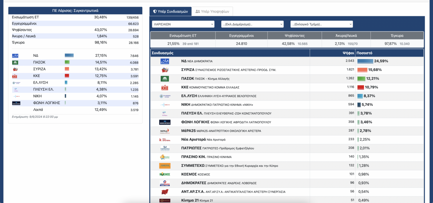 Πως εξελίσσεται η καταμέτρηση στον Δήμο Λαρισαίων στο 21,55% των εκλογικών τμημάτων