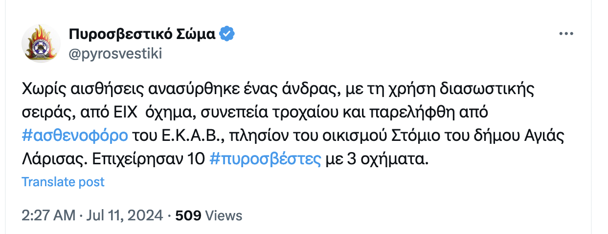 Σε ανάρτηση της Πυροσβεστικής για το συμβάν επισημαίνονται τα εξής: