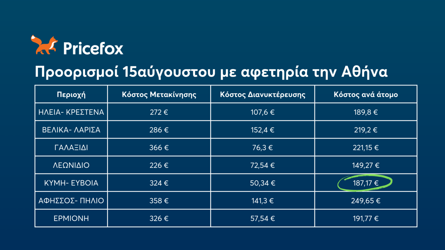 Όπως φαίνεται και από τα παραπάνω στοιχεία το Λεωνίδιο αναδεικνύεται ως η πιο οικονομική επιλογή για το τετραήμερο του 15Αύγουστου, με συνολική τιμή 149,27€ ανά άτομο, ενώ η Αφήσσος στο Πήλιο αποδεικνύεται η πιο ακριβή επιλογή με συνολική τιμή 249,65€ ανά άτομο.