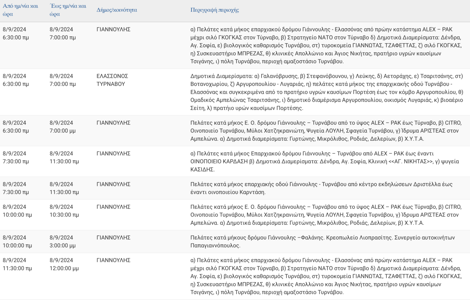 Αναλυτικά, οι περιοχές με τις διακοπές ηλεκτρικού ρεύματος: