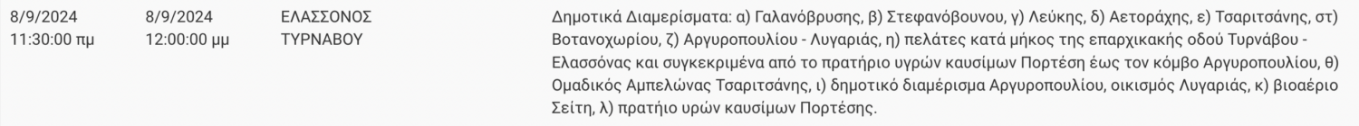Σε προγραμματισμένες διακοπές στην παροχή ηλεκτρικού ρεύματος σε περιοχές της Περιφερειακής Ενότητας Λάρισας θα προχωρήσει την Κυριακή 8 Σεπτεμβρίου 2024 ο ΔΕΔΔΗΕ Α.Ε.