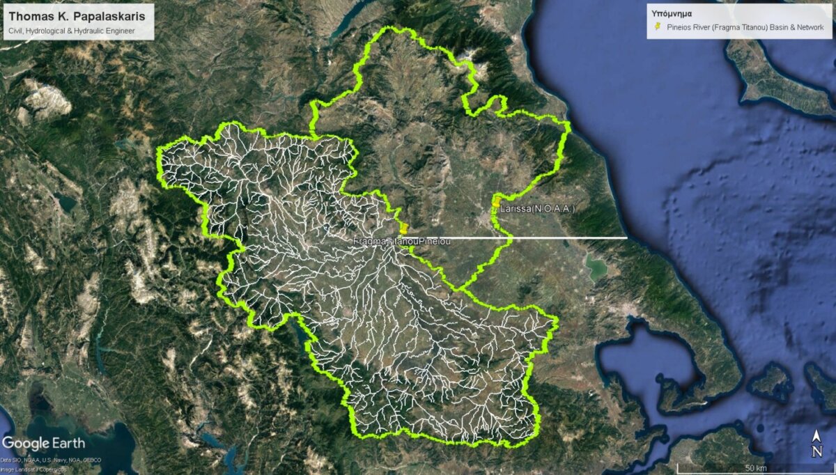 Εικόνα 3. Η απεικόνιση της λεκάνης απορροής, [εξωτερικό, «βόρεια», «δυτικά» και «νότια» και εσωτερικό «ανατολικά», περίγραμμα επιφάνειας με «ανοιχτή πράσινη» απόχρωση, που αντιστοιχεί έως την θέση όπου είχε σχεδιαστεί να κατασκευαστεί το «Φράγμα (Ρουφράκτης) Τιτάνου», [του «“Δήμου Πύλης”, “Νομού (“Π.Ε.”) Τρικάλων”», «“Δήμου Μετεώρων”, “Νομού (“Π.Ε.”) Τρικάλων”», «“Δήμου Μουζακίου”, “Νομού (“Π.Ε.”) Καρδίτσας”», του «“Δήμου Φαρκαδόνας”, “Νομού (“Π.Ε.”) Τρικάλων”», «“Δήμου Παλαμά”, “Νομού (“Π.Ε.”) Καρδίτσας”», «“Δήμου Λίμνης Πλαστήρα”, “Νομού (“Π.Ε.”) Καρδίτσας”», «“Δήμου Καρδίτσας”, “Νομού (“Π.Ε.”) Καρδίτσας”», «“Δήμου Σοφάδων”, “Νομού (“Π.Ε.”) Καρδίτσας”», «“Δήμου Φαρσάλων”, “Νομού (“Π.Ε.”) Λάρισας”» και «“Δήμου Δομοκού”, “Νομού (“Π.Ε.”) Φθιώτιδας”», «“Δήμου Τρικκαίων”, “Νομού (“Π.Ε.”) Τρικάλων”» και «“Δήμου Κιλελέρ”, “Νομού (“Π.Ε.”) Λάρισας”»], του (ελαφρά συνεπτυγμένου) αντίστοιχου, περιεχόμενου σε αυτήν, υδρογραφικού δικτύου (γραμμές με «ανοιχτή άσπρη» απόχρωση), η απεικόνιση της συνολικής λεκάνης απορροής του «Ποταμού Πηνειού», [εξωτερικό, παντού, περίγραμμα επιφάνειας με «ανοιχτή πράσινη» απόχρωση, που αντιστοιχεί έως την θέση εκβολής του «Ποταμού Πηνειού» στο «Αιγαίο Πέλαγος» και της προτεινόμενης «διώρυγας/σήραγγας απαγωγής νερού εκτάκτου ανάγκης» (ευθεία γραμμή, με κατεύθυνση «Δ-Α», με «ανοιχτή άσπρη» απόχρωση), επί του υπόβαθρου της διαδικτυακής πλατφόρμας «Google Earth» [1,2,4,9].