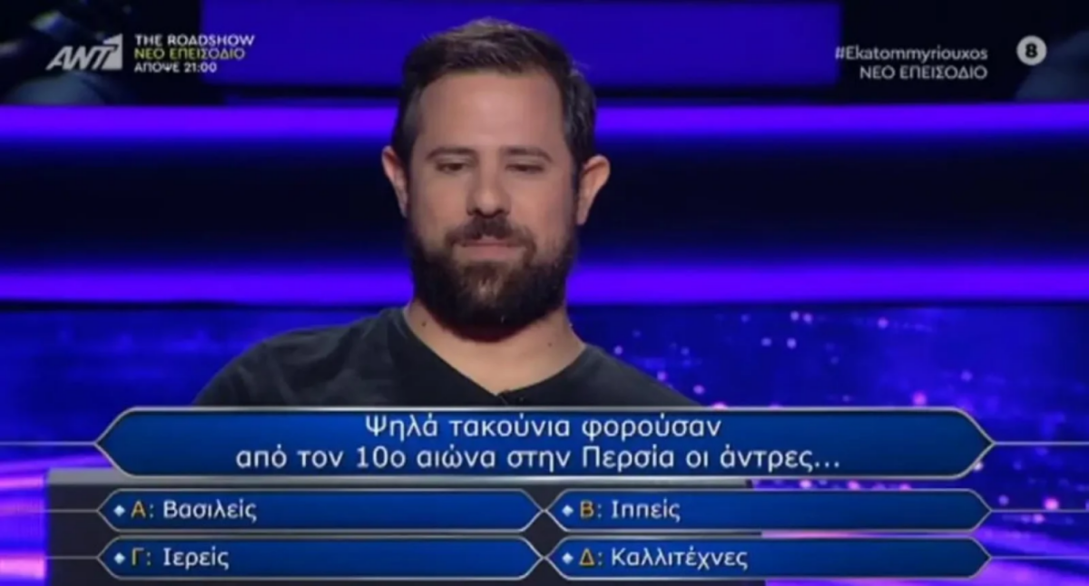 «Ψηλά τακούνια φορούσαν από τον 10ο αιώνα στην Περσία οι άντρες…» σημείωσε χαρακτηριστικά ο οικοδεσπότης του «Ποιος θέλει να γίνει εκατομμυριούχος» στον ΑΝΤ1, Γρηγόρης Αρναούτογλου για να συμπληρώσει τις τέσσερις πιθανές απαντήσεις οι οποίες και ήταν: