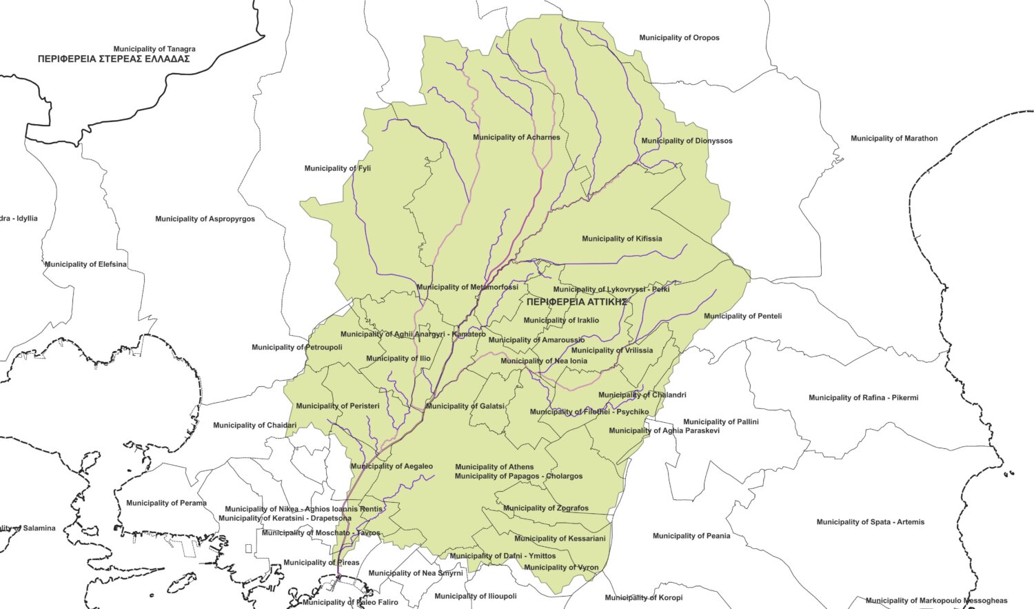 Εικόνα 1. Η απεικόνιση, της «λεκάνης απορροής» (επιφάνεια με «ανοιχτή πράσινη» απόχρωση) (του «”Κηφισού Ποταμού” που αντιστοιχεί έως, περίπου, την θέση στην «εκβολή του»), του «υδρογραφικού (γραμμικού) δικτύου» (γραμμές με «έντονη μπλε» απόχρωση με διαβάθμιση του πάχους της γραμμής, όπου το πάχος της κάθε γραμμής εξαρτάται από την “τάξη” του εκάστοτε ρέματος που αντιπροσωπεύει δηλαδή όσο μεγαλύτερη είναι η “τάξη” του ρέματος τόσο παχύτερη είναι και η αντίστοιχη γραμμή που το αντιπροσωπεύει), των «περιγραμμάτων των διάφορων “Δήμων”, της “Περιφέρειας Αττικής”» οι οποίοι είτε περιέχονται ολόκληροι στην προαναφερθείσα «λεκάνη απορροής» είτε διασταυρώνονται/τέμνονται με την προαναφερθείσα «λεκάνη απορροής» (διακεκομμένες γραμμές με «μαύρη» απόχρωση), όπως απεικονίζονται στο «ελεύθερο διαδικτυακά λογισμικό» «Q.G.I.S.» [4], μέσω των σχετικών αρχείων που ανακτήθηκαν τόσο από την σχετική διαδικτυακή «πλατφόρμα» («Copernicus») όσο και από την σχετική διαδικτυακή «πλατφόρμα» («ΕΛ.ΣΤΑΤ.»),[1,2,4].