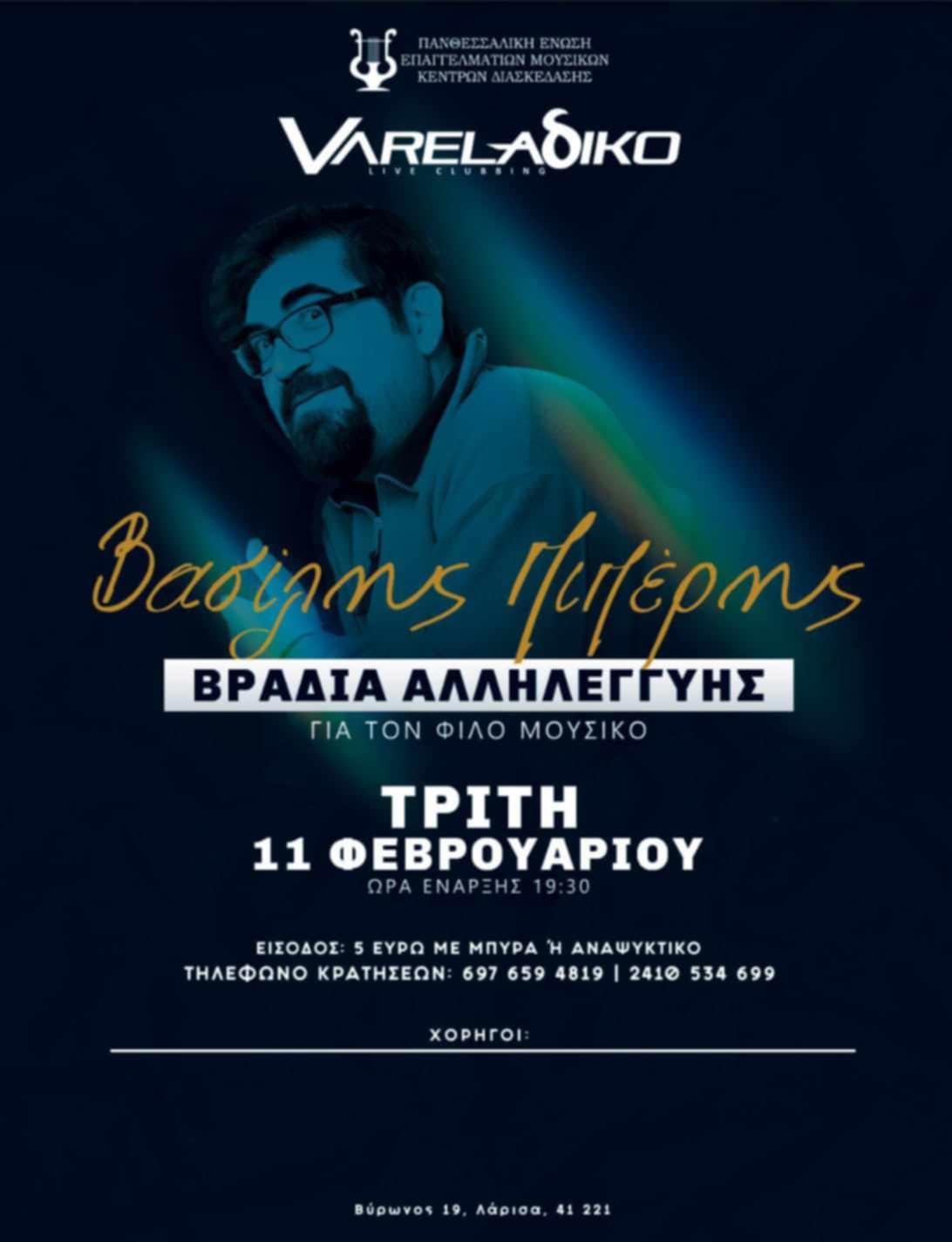 Ο Βασίλης Πιπέρης, είναι ένας άνθρωπος με πολύ χιούμορ, ένα αγαπημένο παιδί της Λάρισας το οποίο έχει περάσει πολλά. «Μια βραδιά αλληλεγγύης για τον φίλο μουσικό Βασίλη Πιπέρη» είναι ο τίτλος της Πανθεσσαλικής Ένωσης Επαγγελματιών Μουσικών Κέντρων Διασκέδασης, που διοργανώσει μια βραδιά στο Βαρελάδικο της Λάρισας στις 11 Φεβρουαρίου 2025 με ώρα έναρξης στις 19:30. Αλληλεγγύη και στήριξη στον Βασίλη Πιπέρη…