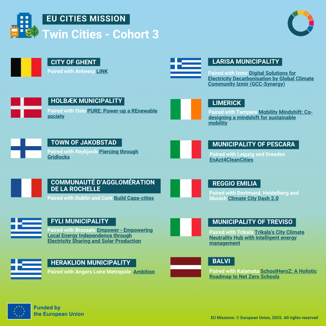 Ο Δήμος Λαρισαίων εκφράζει την ικανοποίησή του για την επιλογή συμμετοχής στο Cities Mission Twinning Learning Programme, που υλοποιείται στο πλαίσιο του NetZeroCities. Μαζί με άλλες 23 πόλεις θα ξεκινήσει ένα φιλόδοξο ταξίδι κοινής μάθησης και συνεργασίας για την επίτευξη κλιματικής ουδετερότητας. Οι συνολικά 24 πόλεις εντάσσονται σε ένα ευρύτερο δίκτυο 56 πόλεων, ανεβάζοντας τον συνολικό αριθμό των twin cities σε 80.