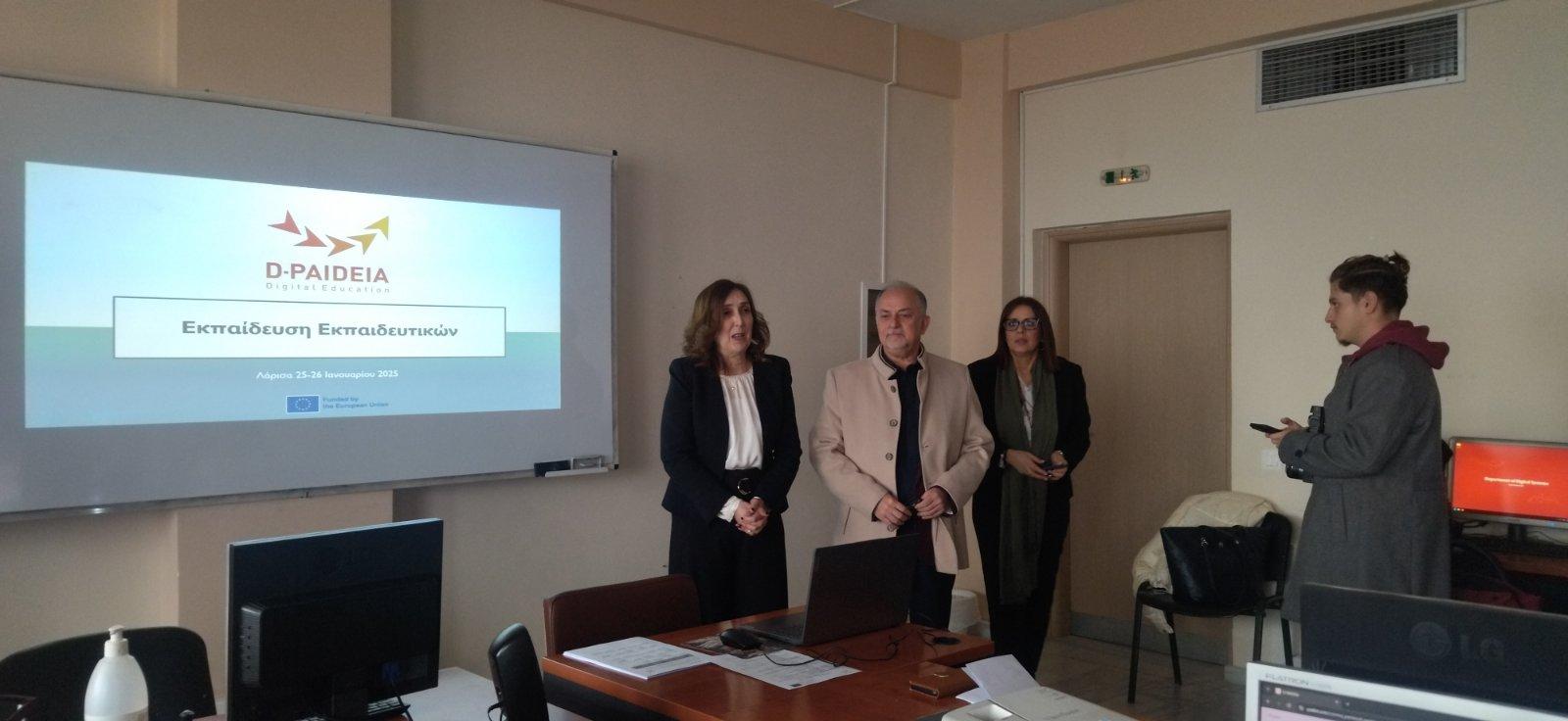 Στόχος της επιμορφωτικής δράσης, η οποία απευθύνεται σε εκπαιδευτικούς της Δ.Π.Ε. Λάρισας, ήταν η υποστήριξη των σχολικών μονάδων, προκειμένου να αναπτύξουν το δικό τους Ψηφιακό Σχέδιο Δράσης και η ενίσχυση των ψηφιακών παιδαγωγικών δεξιοτήτων των εκπαιδευτικών. Υλοποιήθηκε στο πλαίσιο του Ευρωπαϊκού Προγράμματος Erasmus+ D-PAIDEIA (101087643 – ERASMUS-EDU-2022-PI-FORWARD), το οποίο συντονίζει ο φορέας Action Synergy, σε συνεργασία με το Πανεπιστήμιο της Φλωρεντίας (Ιταλία), το Πανεπιστήμιο της Τζιρόνα (Ισπανία), το Πανεπιστήμιο UCLL στο Leuven (Βέλγιο), το Κέντρο Δημιουργικής Μάθησης (Βουλγαρία) και τον οργανισμό All Digital (Βέλγιο). Το πρόγραμμα αποτελεί πρόταση επικαιροποίησης του DigCompEdu, εστιάζοντας ιδιαίτερα στις κοινωνικο-σχεσιακές πτυχές της χρήσης της εκπαιδευτικής τεχνολογίας, πάνω στους παρακάτω άξονες: