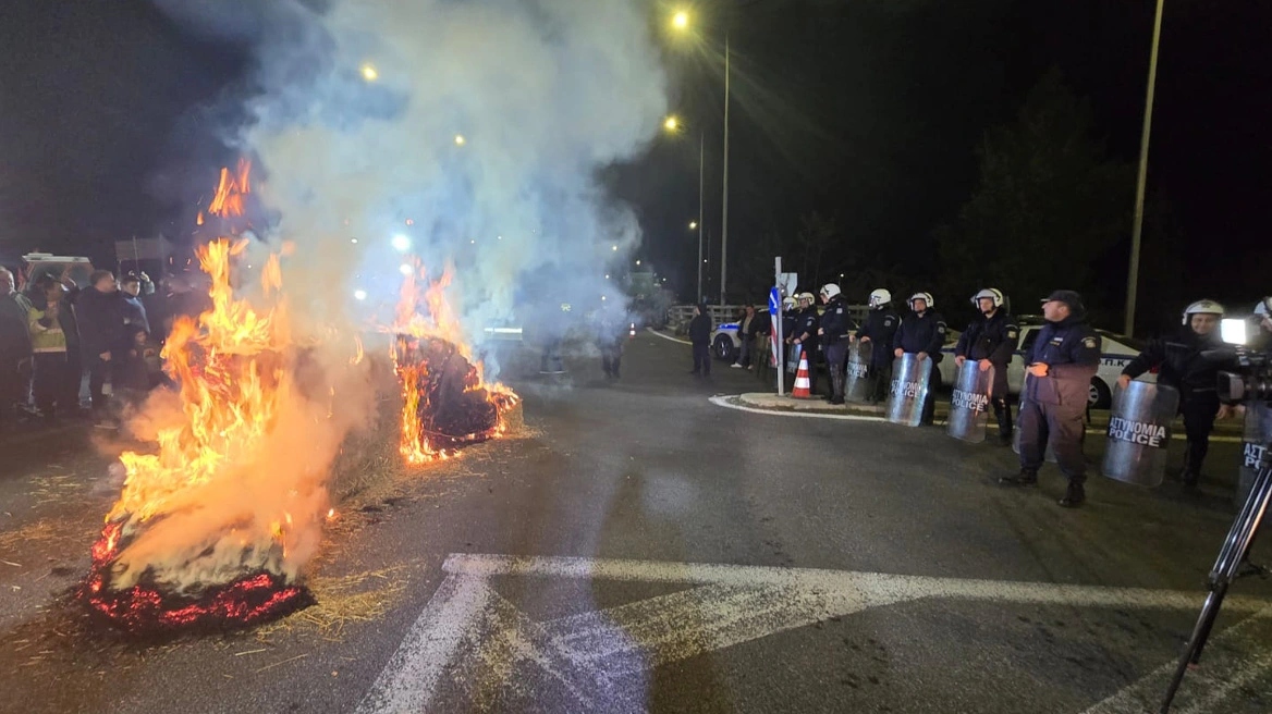 Το απόγευμα της Πέμπτης οι αγρότες από το μπλόκο της Γυρτώνης, παρέταξαν τα τρακτέρ τους στον κόμβο της ΠΑΘΕ μπροστά στις αστυνομικές δυνάμεις και σε ένδειξη διαμαρτυρίας έκαψαν μπάλες άχυρου.