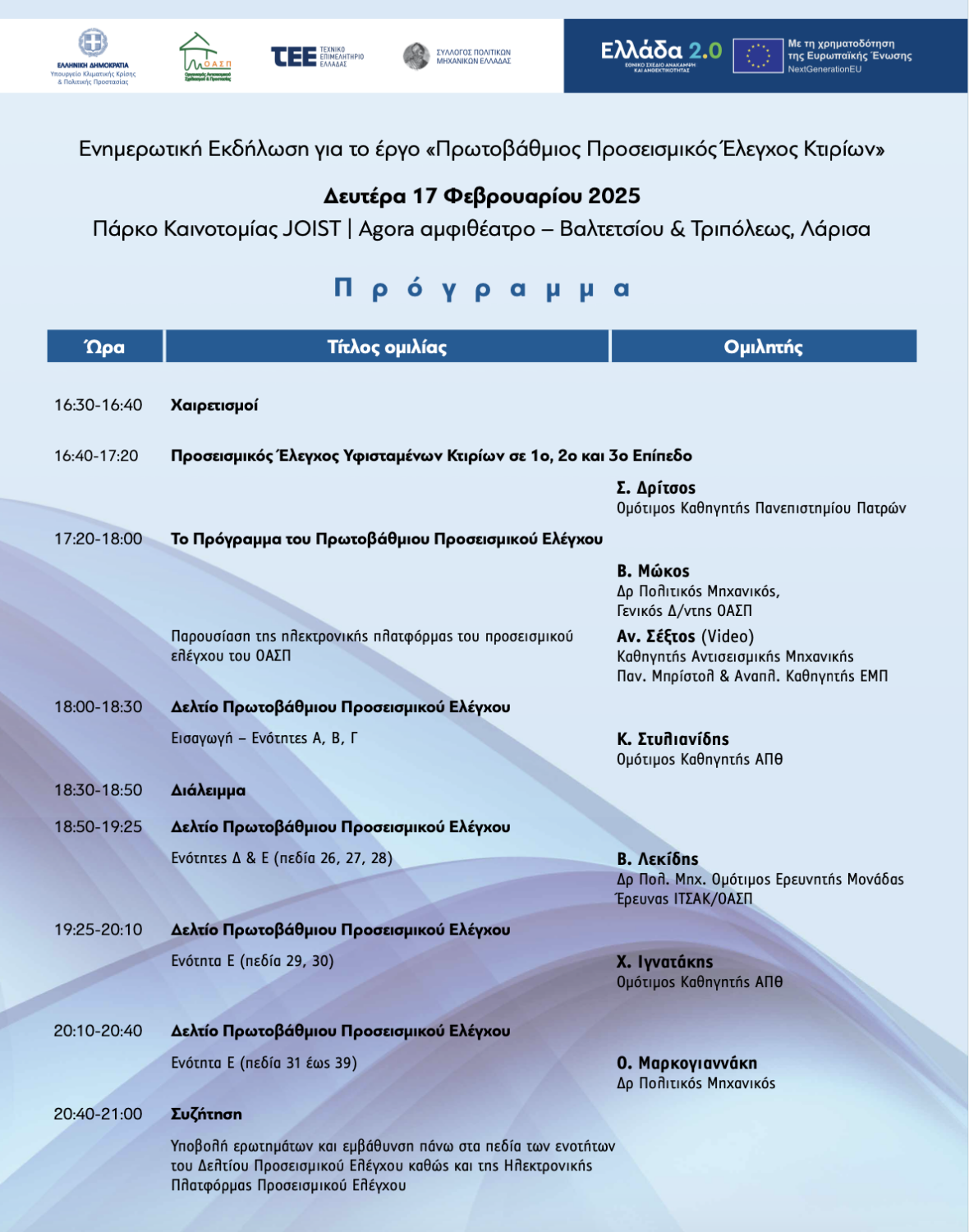 Το ΤΕΕ/ΤΚΔΘ και ο Σύλλογος Πολιτικών Μηχανικών Λάρισας διοργανώνουν ενημερωτική εκδήλωση με θέμα τον «Πρωτοβάθμιο Προσεισμικό Έλεγχο Κτιρίων». Η εκδήλωση θα πραγματοποιηθεί τη Δευτέρα 17 Φεβρουαρίου 2025 και ώρα 16:30, στο Πάρκο Καινοτομίας JOIST (Βαλτετσίου & Τριπόλεως, Λάρισα).