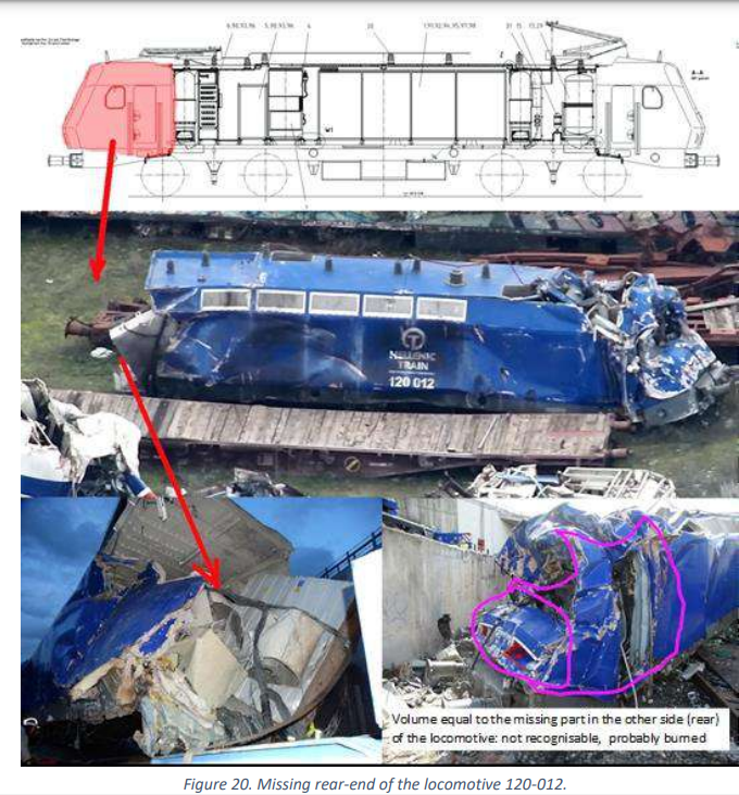 Ο ΕΟΔΑΣΑΑΜ υποθέτει πως αυτό το κομμάτι της ηλεκτράμαξας βρίσκεται μεταξύ των συντριμμιών του κυλικείου της επιβατικής αμαξοστοιχίας όπου εκεί η φωτιά μετά την σύγκρουση ήταν εντονότερη. Να σημειωθεί πως ο Οργανισμός στο πόρισμα του σχετικά με τα αίτια της φωτιάς αναφέρει πως θεωρεί πιθανή την ύπαρξη άγνωστης εύφλεκτης ουσίας και όχι τα έλαια σιλικόνης.