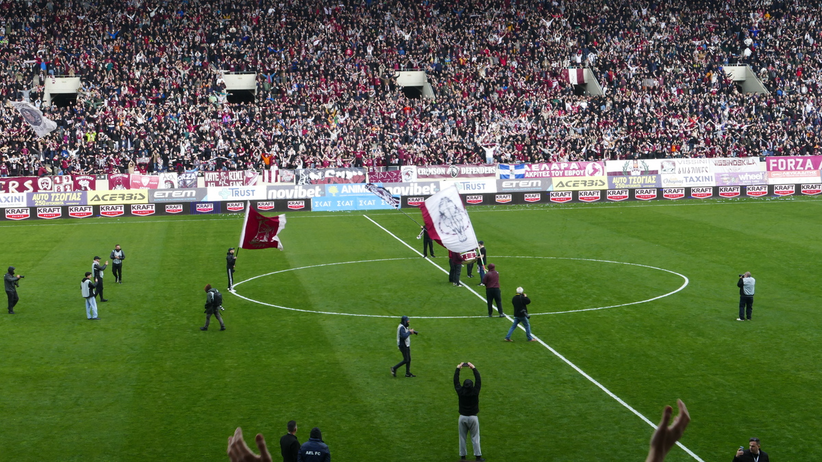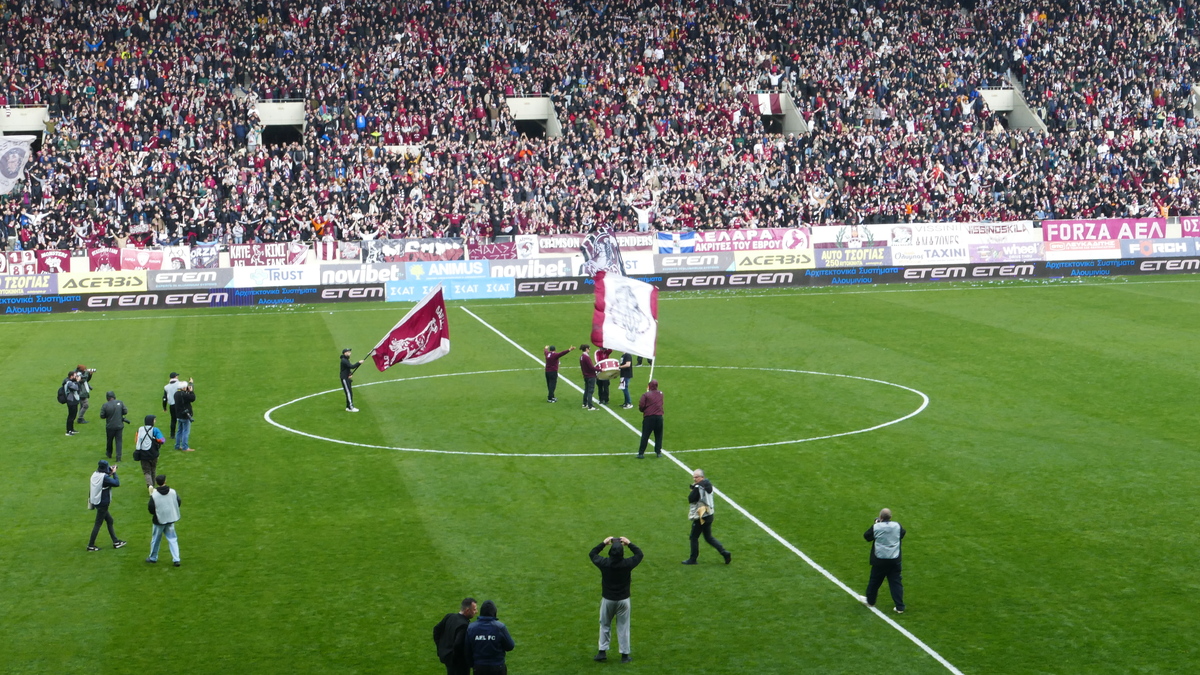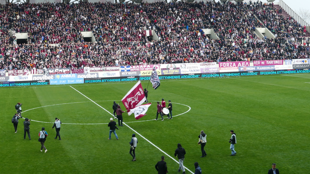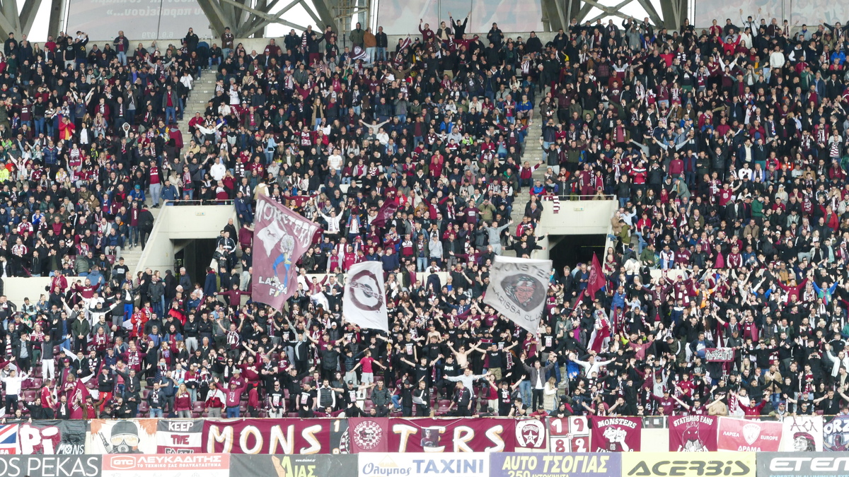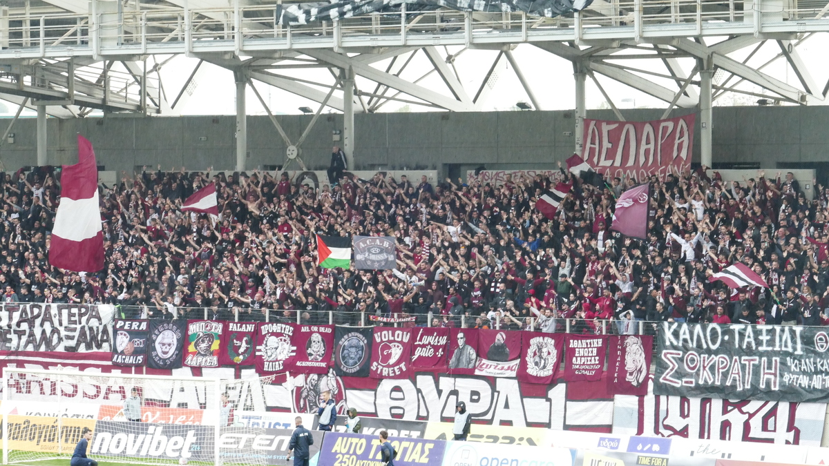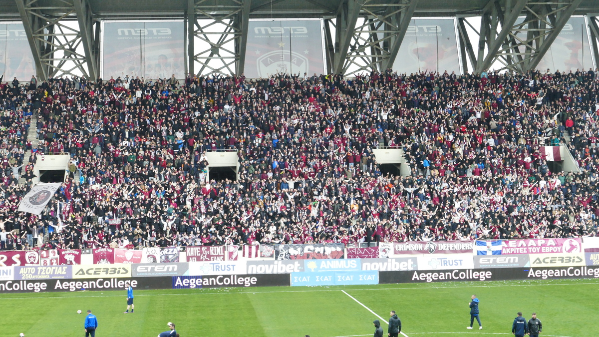 Το λαρισινό γήπεδο έχει κατακλυστεί από «βυσσινί» φιλάθλους, που ζουν με την αγωνία της επιστροφής, καταγράφοντας μία εντυπωσιακή παρουσία που δεν τη συναντάς στη συγκεκριμένη κατηγορία (και στα περισσότερα γήπεδα της μεγάλης εθνικής κατηγορίας).