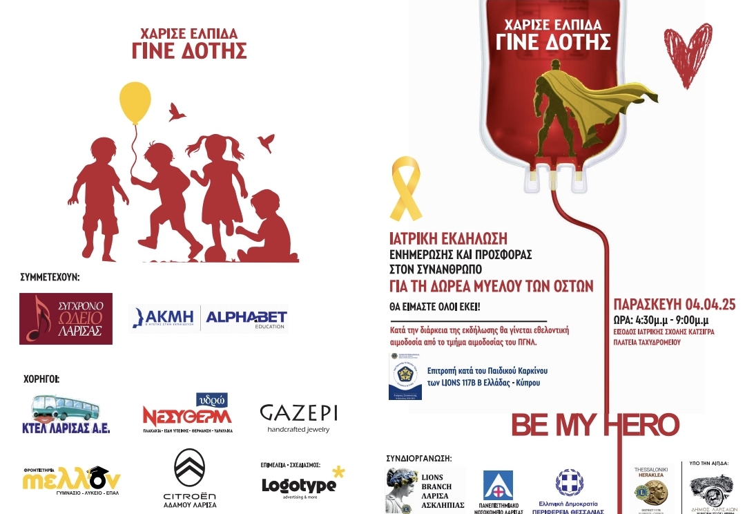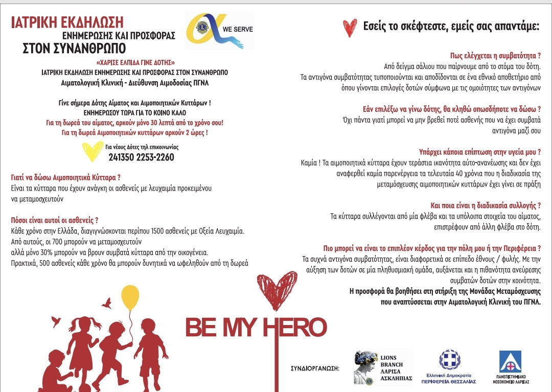 Το Lions Branch Λάρισα Ασκληπίας της Λέσχης Θεσσαλονίκη Ηράκλεια σε συνδιοργάνωση με την Περιφέρεια Θεσσαλίας με το Αιματολογικό Τμήμα του Πανεπιστημιακού Νοσοκομείο Λάρισας, τον καθηγητή του κο Βασιλόπουλο καθώς και με το τμήμα Αιμοδοσίας του Πανεπιστημιακού Νοσοκομείου Λάρισας και τη διευθύντριά του κυρία Παρασκευή Κώτση , υπό την αιγίδα της Αντιδημαρχίας Κοινωνικής Πολιτικής του Δήμου Λαρισαίων θα υλοποιήσουν στην Πλατεία Ταχυδρομείου Λάρισας την ημερομηνία 4 Απριλίου και ώρες 4:30 μ.μ. με 9.00 μ.μ. ιατρική δράση ευαισθητοποίησης των πολιτών σχετικά με τη δωρεά μυελού των οστών και παράλληλη αιμοδοσία