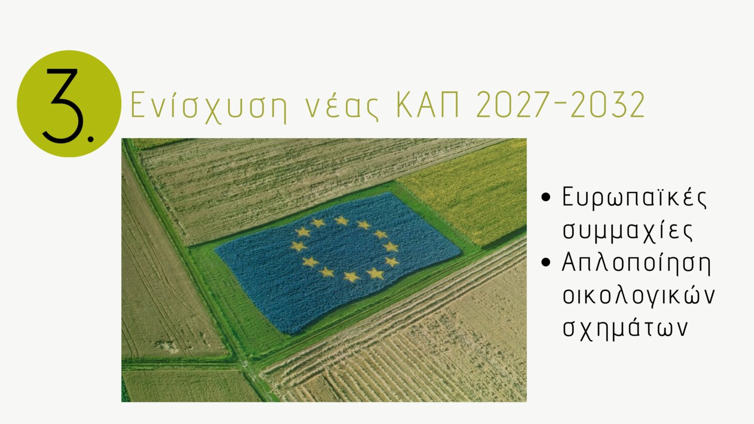 3ο) Ευρωπαϊκές Συμμαχίες για την σταθερή ενίσχυση της νέας ΚΑΠ από το 2027 και μετά χωρίς περικοπή πόρων στους αγρότες. Ειδικότερα από φέτος και έως το 2027 με ενδεχόμενη 2ετή επέκταση έως το 2029, να απλοποιηθεί η διαδικασία των οικολογικών σχημάτων που σήμερα αφαιρούν ενισχύσεις από τους αγρότες και διανέμονται σε τρίτους.