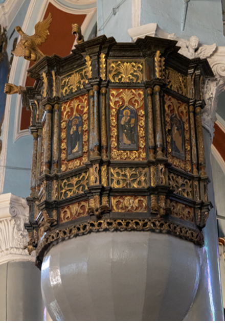 Από την μία άκρη έως την άλλη υπάρχει σκαλιστή και περίτεχνη άμπελος 13,60 Χ 0,28 μ., έχοντας στο μέσο το έτος κατασκευής 1874, κάτω ένα άνθρωπο κεφάλι. Στο επάνω μέρος του κέντρου δεσπόζει η εικόνα του Μυστικού Δείπνου (1,86 Χ 0,95 μ.), μεγάλες κυκλικές ροζέτες λουλουδιών, με εσωστρεφή διάταξη φύλλων να ακουμπούν σε πέταλα μαργαρίτας. Οι διστάσεις του κεντρικού μέρους είναι 6,10 Χ 1,15μ.