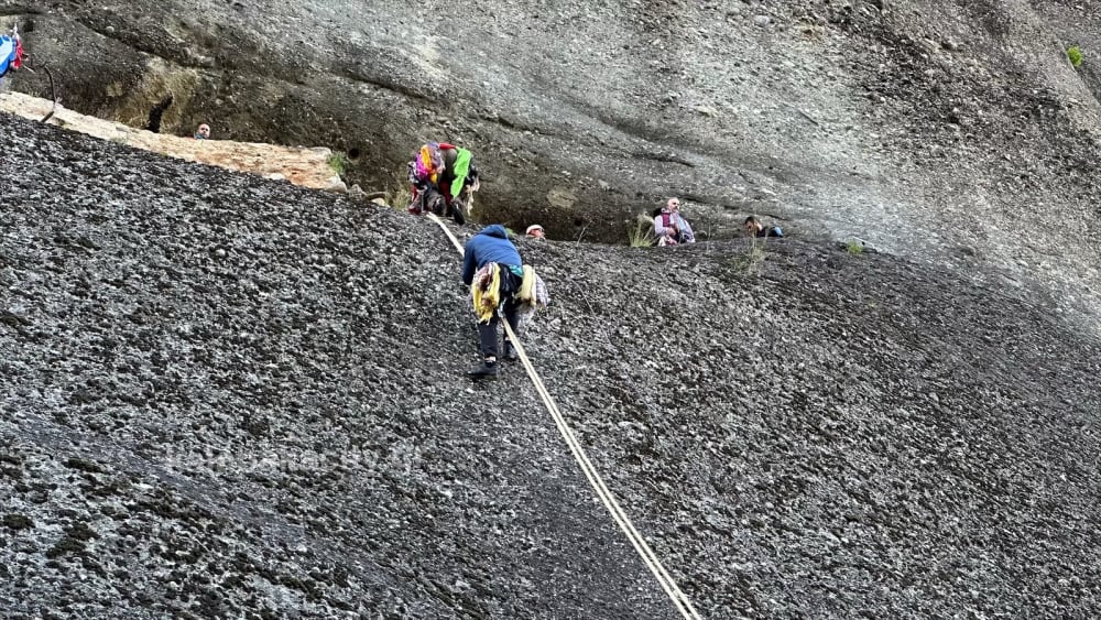 Οι πρώτοι αναρριχητές έστησαν τα σκοινιά και άνοιξαν τον δρόμο για τους επόμενους, οι οποίοι ανέλαβαν το έργο της ανάρτησης και κατεβάσματος των πολύχρωμων μαντηλιών.