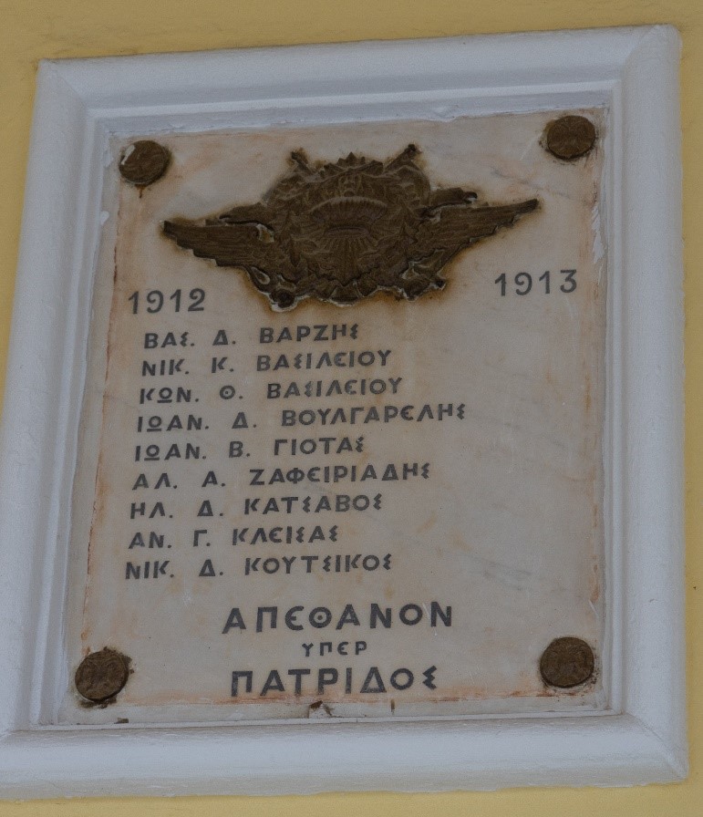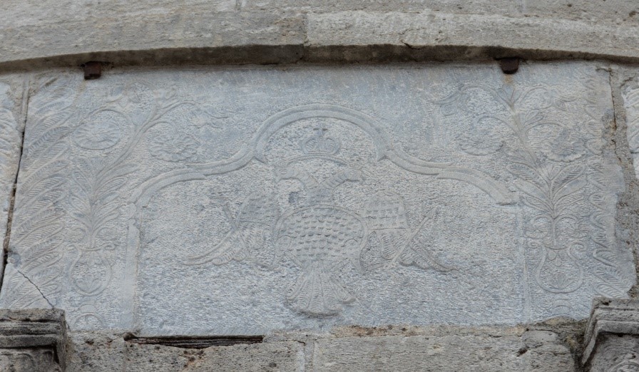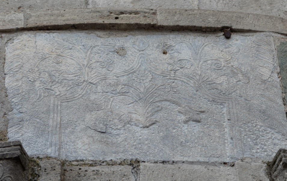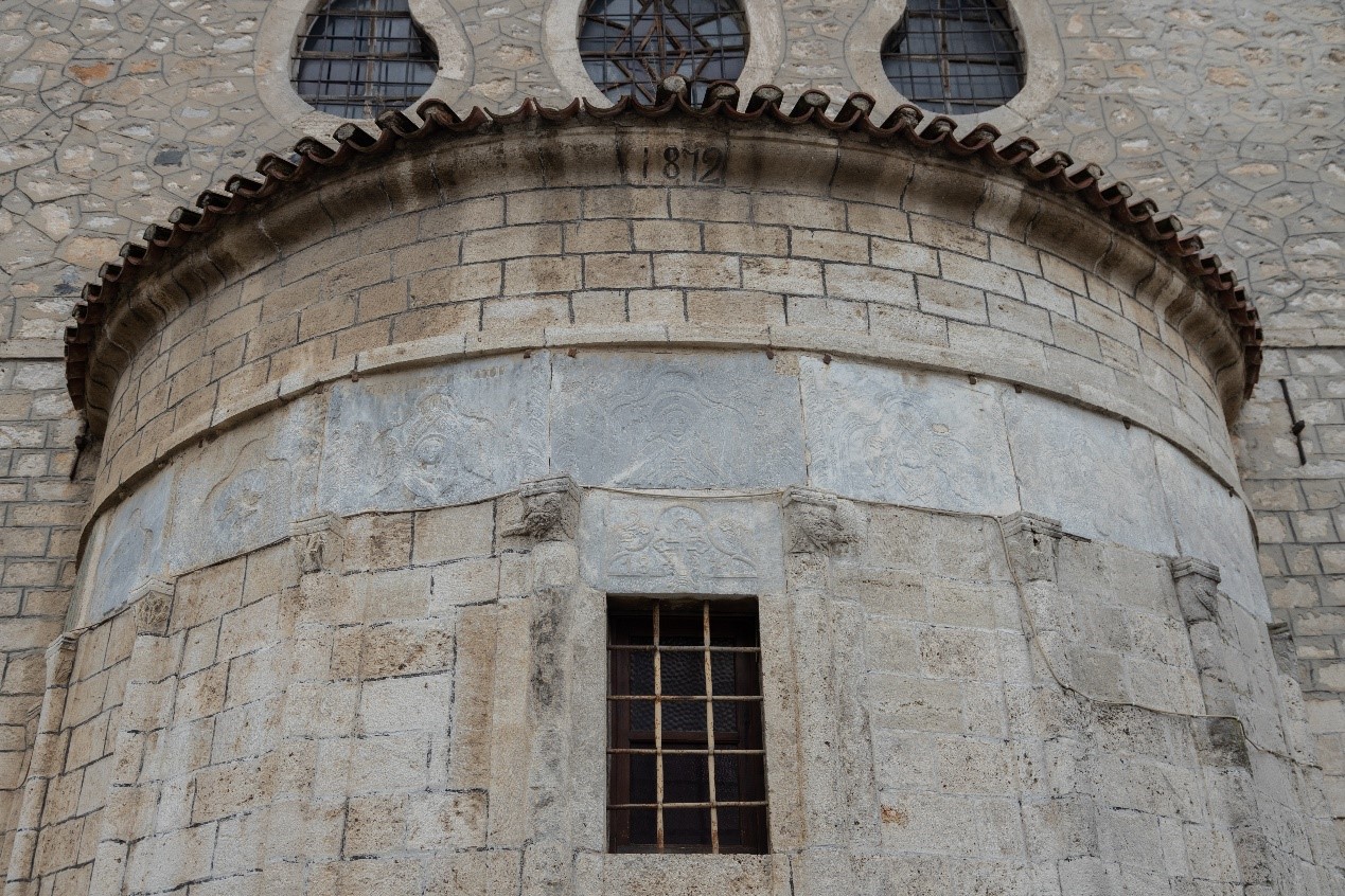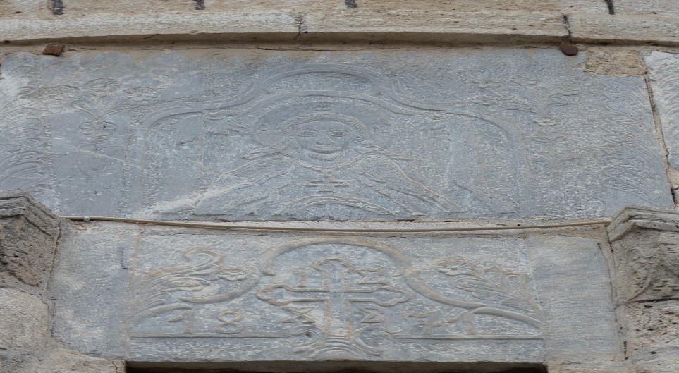 Οι πετρόκτιστες οι εκκλησίες της περιοχής, έχουν κάποια κομμάτια μαρμάρου με πιο περίτεχνο σκάλισμα και αλλά έχουν χρησιμοποιηθεί για τον εσωτερικό η εξωτερικό διάκοσμο του Ναού. Στις παρακάτω φωτογραφίες παρουσιάζονται κάποια από την εξωτερική πλευρά της εκκλησίας από την τελική ανακατασκευή του 1871-1872. Τα λιθανάγλυφα έχουν παραστάσεις, με εξαπτέρυγα, με σταυρό και με φυτικό και ζωικό διάκοσμο όπως αετούς, περιστέρι και βάζα με άνθη.
