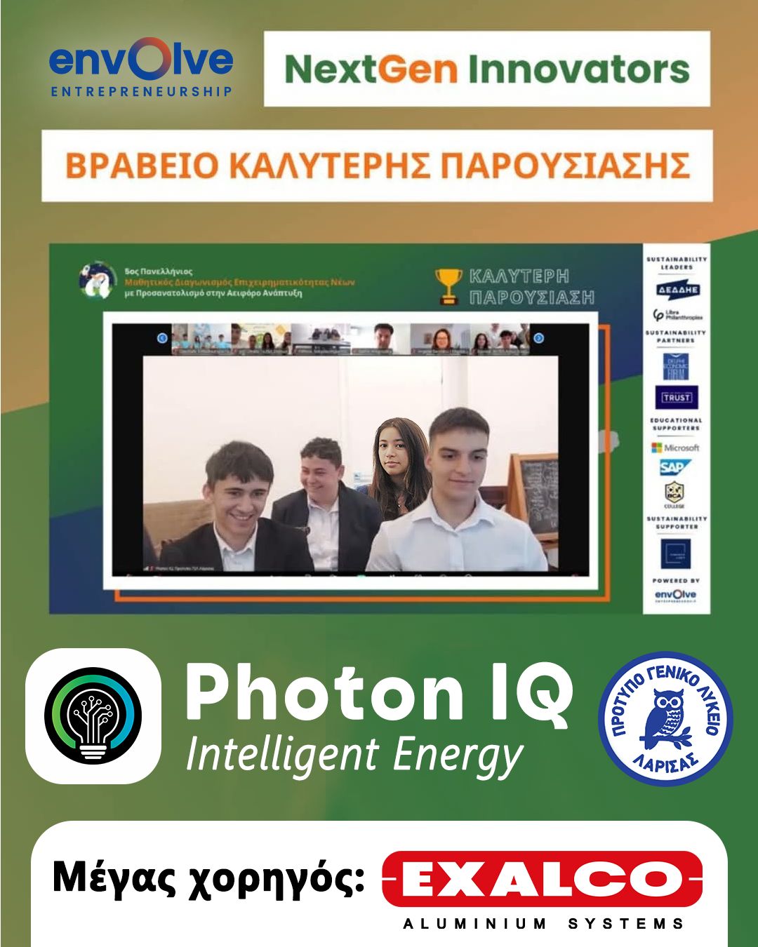 H Ομάδα του Προτύπου ΓΕΛ Λάρισας παρουσίασε το business plan της μαθητικής – εικονικής επιχείρησης με την επωνυμία «Photon ΙQ» που αφορά στην ολιστική διαχείριση της ενέργειας με τη χρήση της ΑΙ (Artificial Intelligence – τεχνητής νοημοσύνης), κερδίζοντας, όπως προαναφέρθηκε στο τελικό το Βραβείο Καλύτερης Παρουσίασης . Την ομάδα αποτελούν οι Γκανάς Αστέριος, Κολιός Γρηγόρης, Κουτσογιάνννης Ευάγγελος και Μούστου Αναστασία, με υπεύθυνη εκπαιδευτικό την καθηγήτρια κλ. ΠΕ Οικονομίας του σχολείου κ. Ουρανία Βαϊρακτάρη.