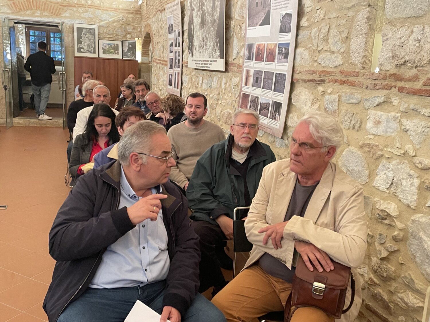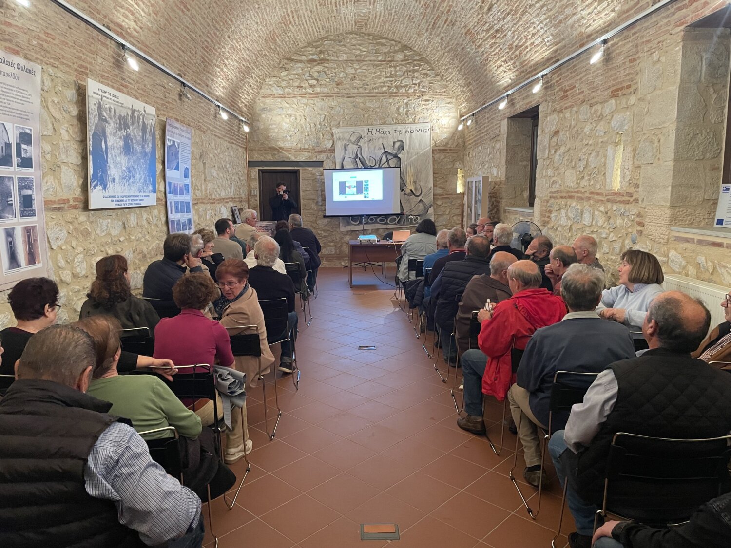 Πριν την ομιλία του βουλευτή του ΚΚΕ, παρουσιάστηκαν δύο βίντεο στην κατάμεστη από κόσμο αίθουσα εκδηλώσεων του μουσείου.