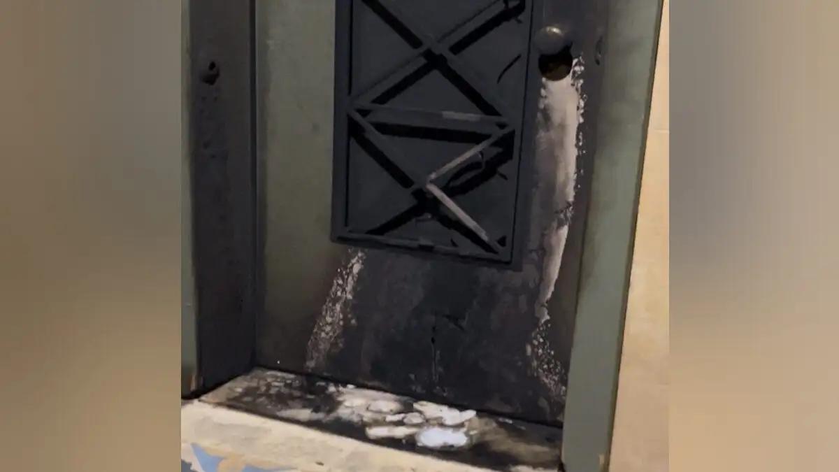 Από την έκρηξη προκλήθηκε μικρής έκτασης φωτιά στην πόρτα της εισόδου.