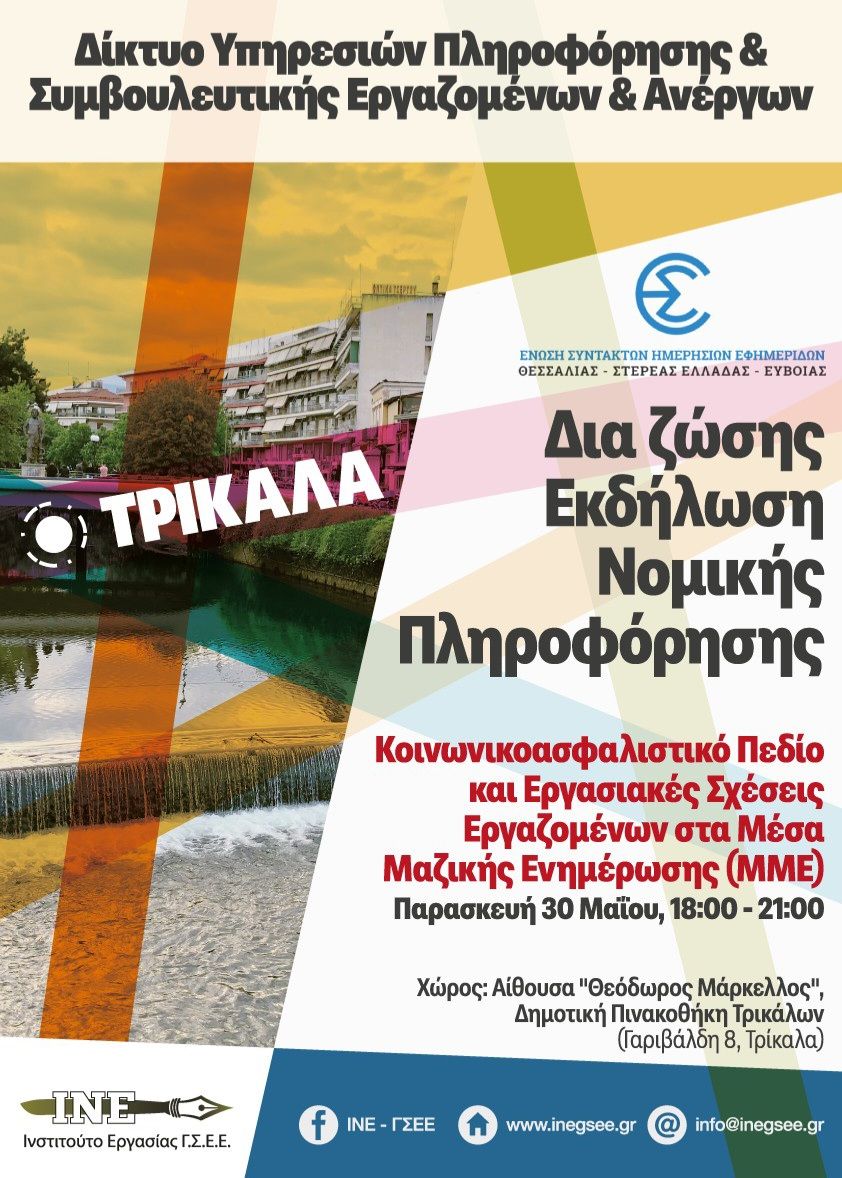 Δια ζώσης εκδήλωση νομικής πληροφόρησης διοργανώνεται την Παρασκευή 30 Μαΐου 2025, στα Τρίκαλα, από το Δίκτυο Πληροφόρησης και Συμβουλευτικής Εργαζομένων και Ανέργων του ΙΝΕ ΓΣΕΕ Θεσσαλίας, σε συνεργασία με την Ένωση Συντακτών Ημερησίων Εφημερίδων Θεσσαλίας, Στερεάς Ελλάδας και Εύβοια (ΕΣΗΕΘΣτΕ-Ε).