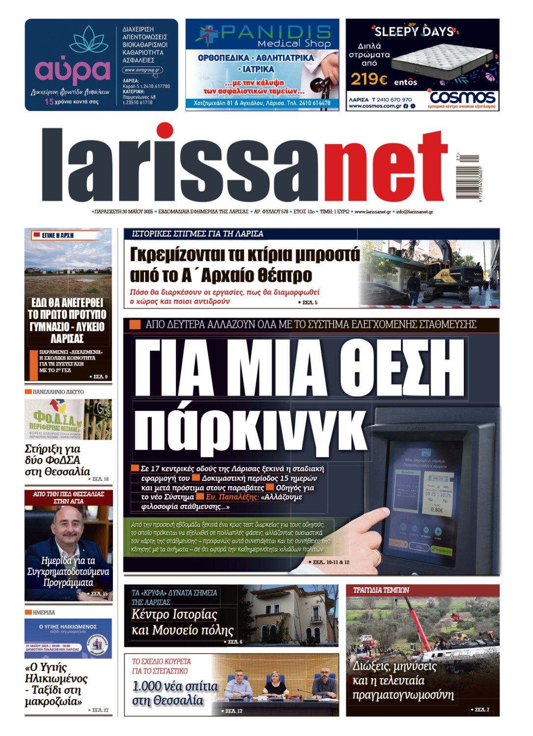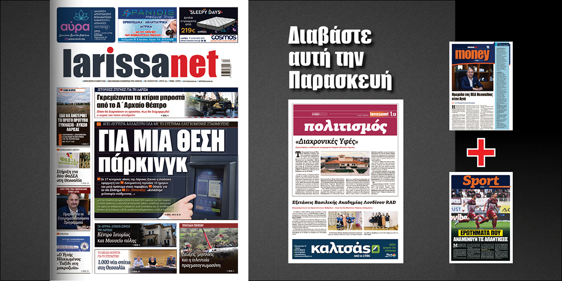 Με πρώτο θέμα και τίτλο «Για μια θέση πάρκινγκ» κυκλοφορεί αυτή την Παρασκευή η εφημερίδα μας, με όλες τις τελευταίες εξελίξεις γύρω από την τις αλλαγές και το σύστημα ελεγχόμενης στάθμευσης στη Λάρισα.