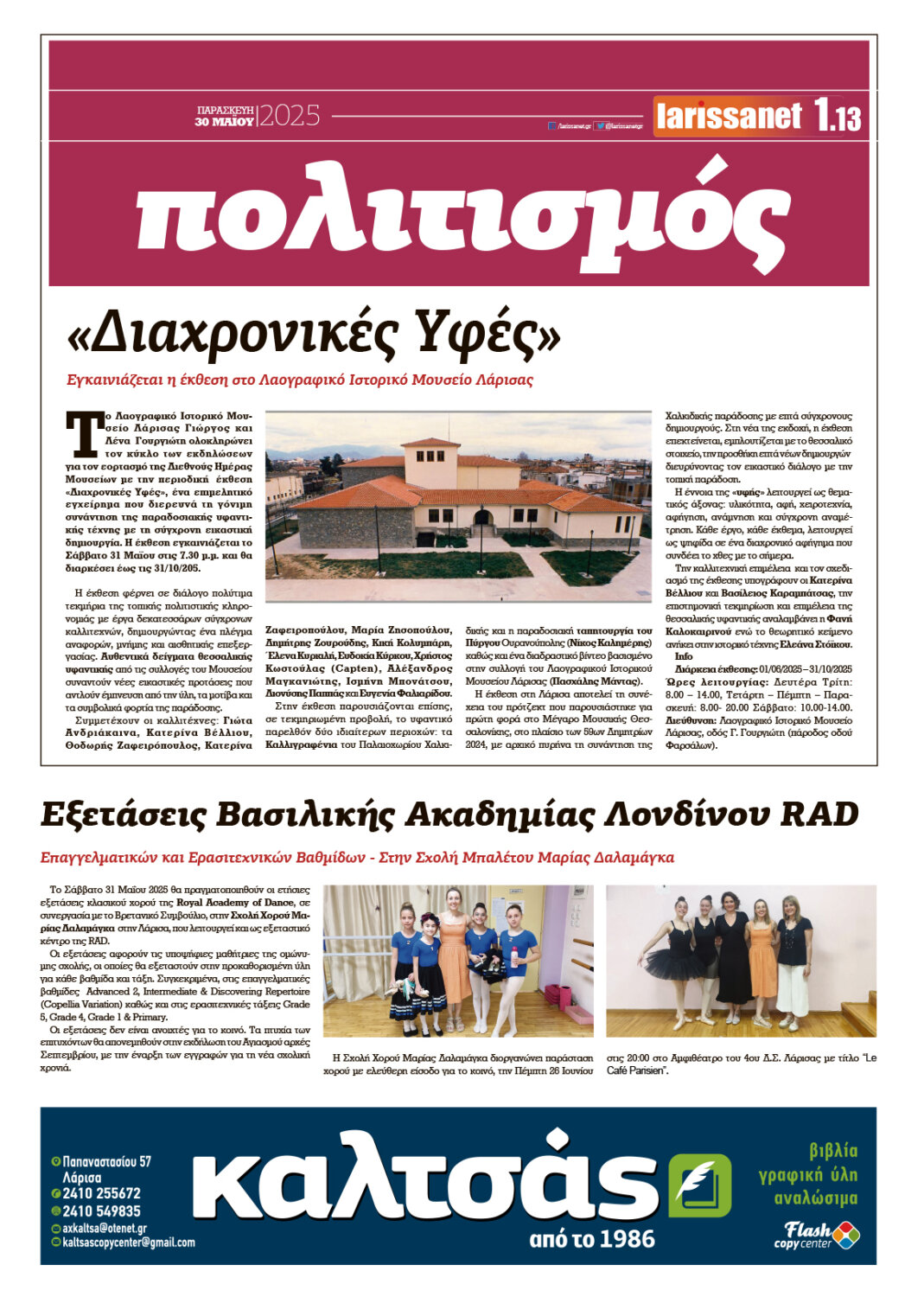 - «∆ιαχρονικές Υφές». Εγκαινιάζεται η έκθεση στο Λαογραφικό Ιστορικό Μουσείο Λάρισας.