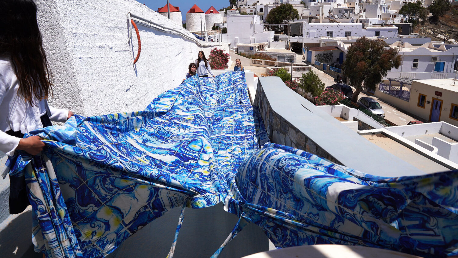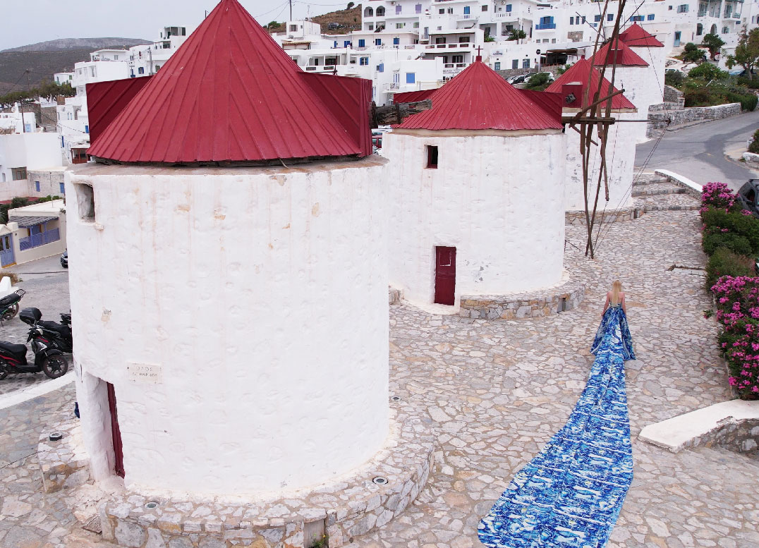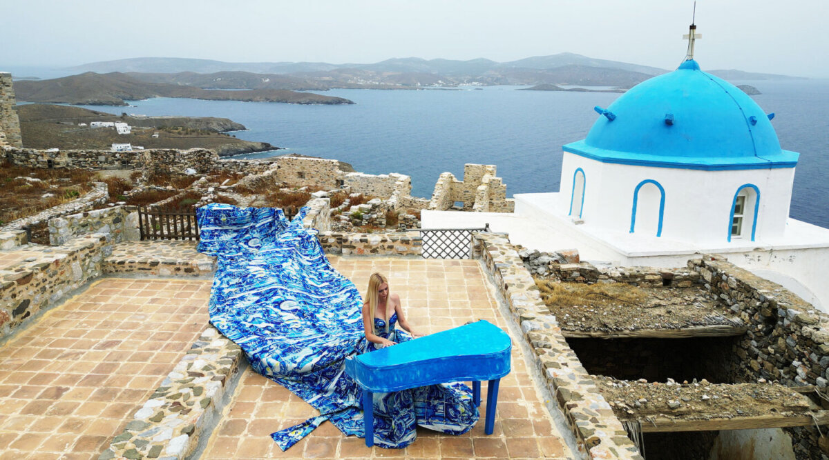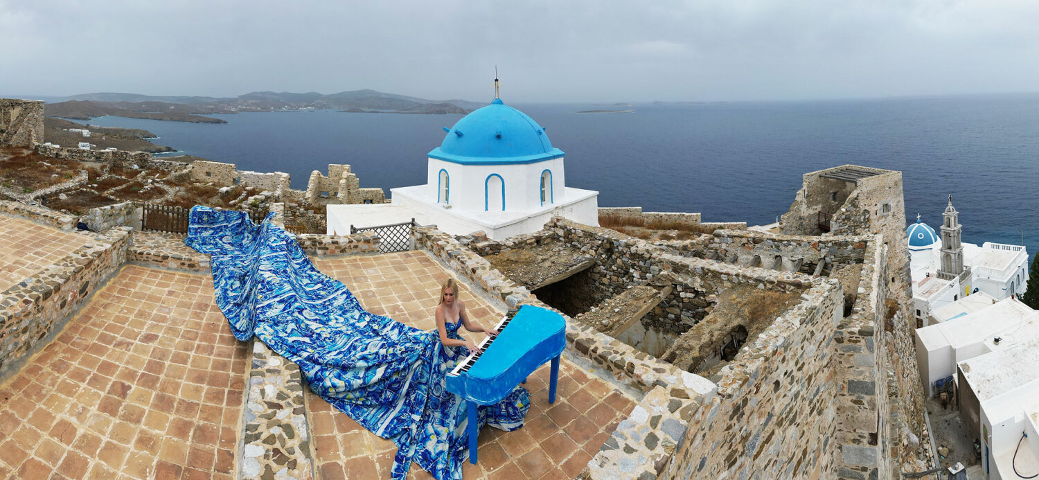 Στη συνέχεια, το φόρεμα πήρε ζωή μέσα από τη χαρισματική πιανίστρια Έλενα Ξυδιά, η οποία φορώντας το, ερμήνευσε κομμάτια κλασικής μουσικής στα πιο μαγευτικά τοπία Ελλάδας και Πορτογαλίας. Στην Αστυπάλαια, με φόντο το Αιγαίο. Στο Κασκάις και στο Κάμπο ντα Ρόκα, με την πλάτη στον Ατλαντικό. Σε κάθε της νότα, το φόρεμα ανέμιζε σαν σημαία που υπερασπίζεται το αύριο, ντύνοντας το σώμα και τη δράση με ήχο, πνοή και συγκίνηση.