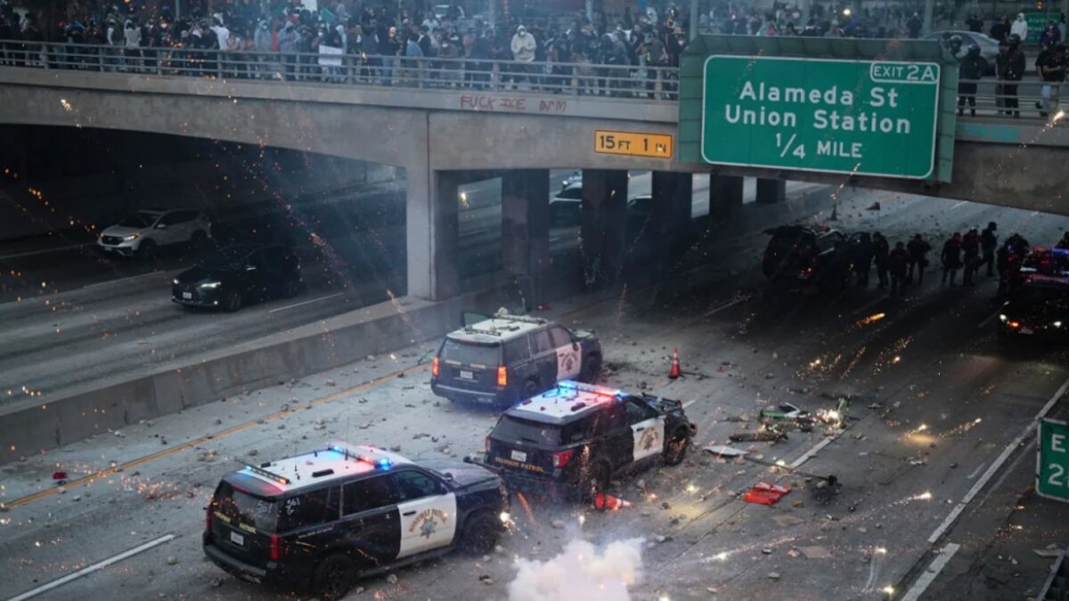 BREAKING: Los Angeles sees escalating unrest. Demonstrators have damaged police cruisers on U.S. Route 101 by hurling objects from an overpass, while barricades are now erected outside City Hall. pic.twitter.com/6a7hTDcwIJ