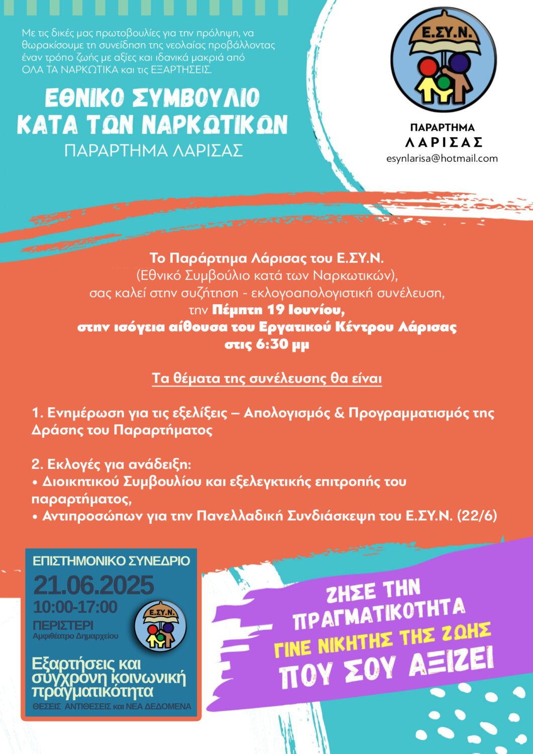 Το Παράρτημα Λάρισας του Ε.ΣΥ.Ν. (Εθνικό Συμβούλιο κατά των Ναρκωτικών), «καλεί στην συζήτηση εκλογοαπολογιστική συνέλευση, την Πέμπτη 19 Ιουνίου, στην ισόγεια αίθουσα του Εργατικού Κέντρου Λάρισας στις 6:30 μμ
