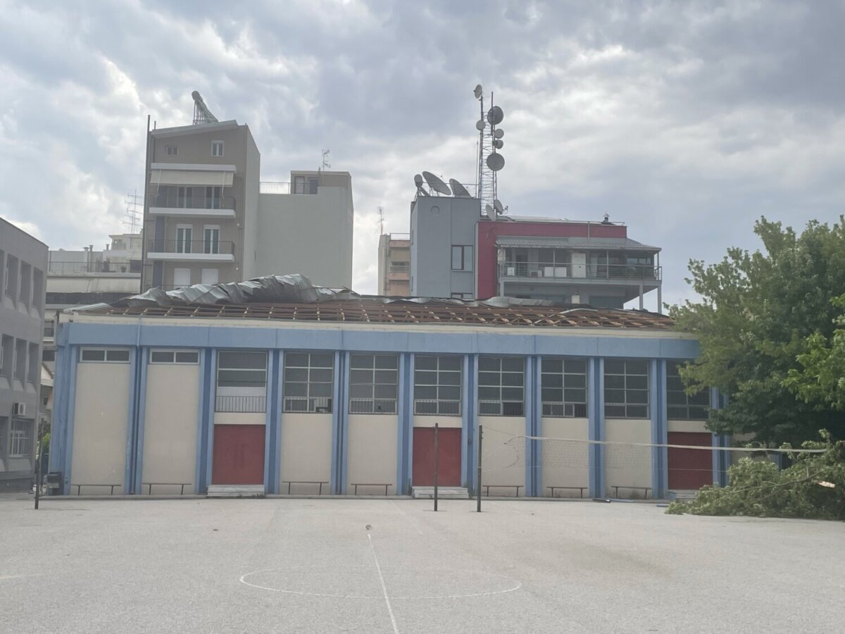 Παράλληλα «θύμα» του δυνατού αέρα έπεσε και η στέγη του γυμναστηρίου του 5ου Γυμνασίου που την «ξήλωσε» ο αέρας, και μάλιστα έχει διακοπεί από την αστυνομία η κίνηση επί της Κομνηνών, ενώ στο προαύλιο του σχολείου έπεσε ένα δέντρο.