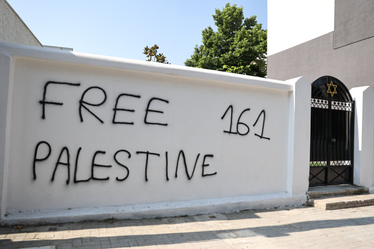 Νωρίς το πρωί της Παρασκευής διαπιστώθηκε πως έχουν γραφεί συνθήματα στους εξωτερικούς τοίχους της Εβραϊκής Συναγωγής, η οποία εγκαινιάστηκε την περασμένη Κυριακή.