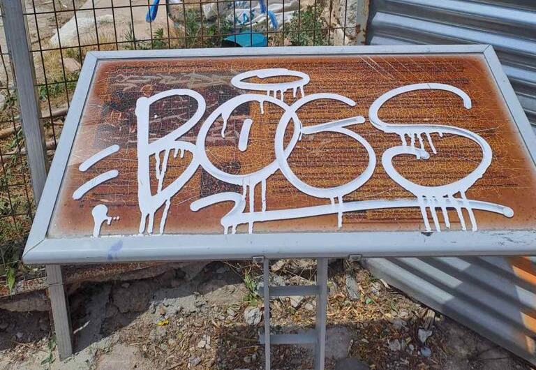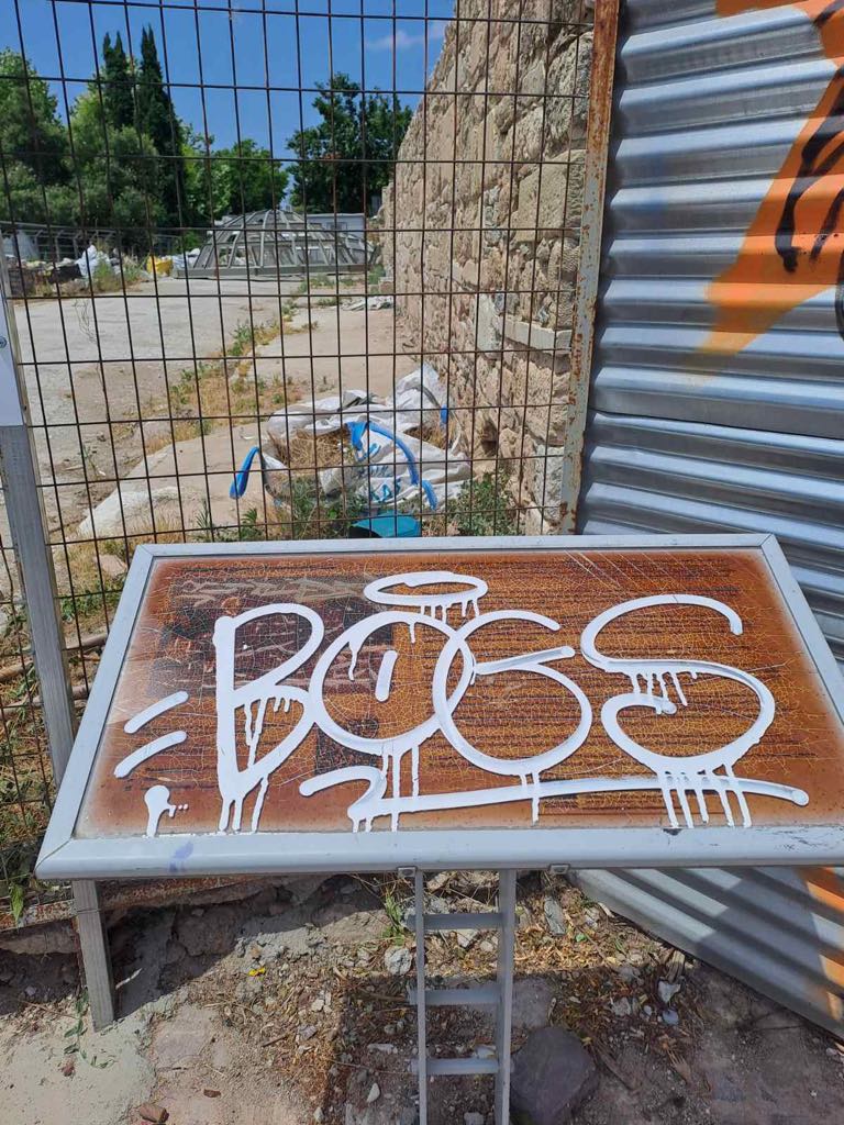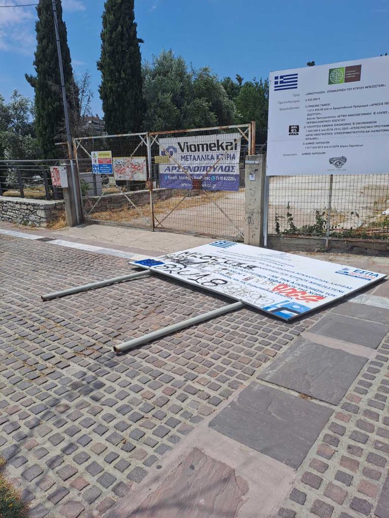 Σε ένα από τα πιο πολυσύχναστα μέρη, στο πλακόστρωτο βρίσκεται πεσμένη μεγάλη επιγραφή, ενώ με σπρέι έχουν καταστραφεί επιγραφές για τα Μνημεία της περιοχής.