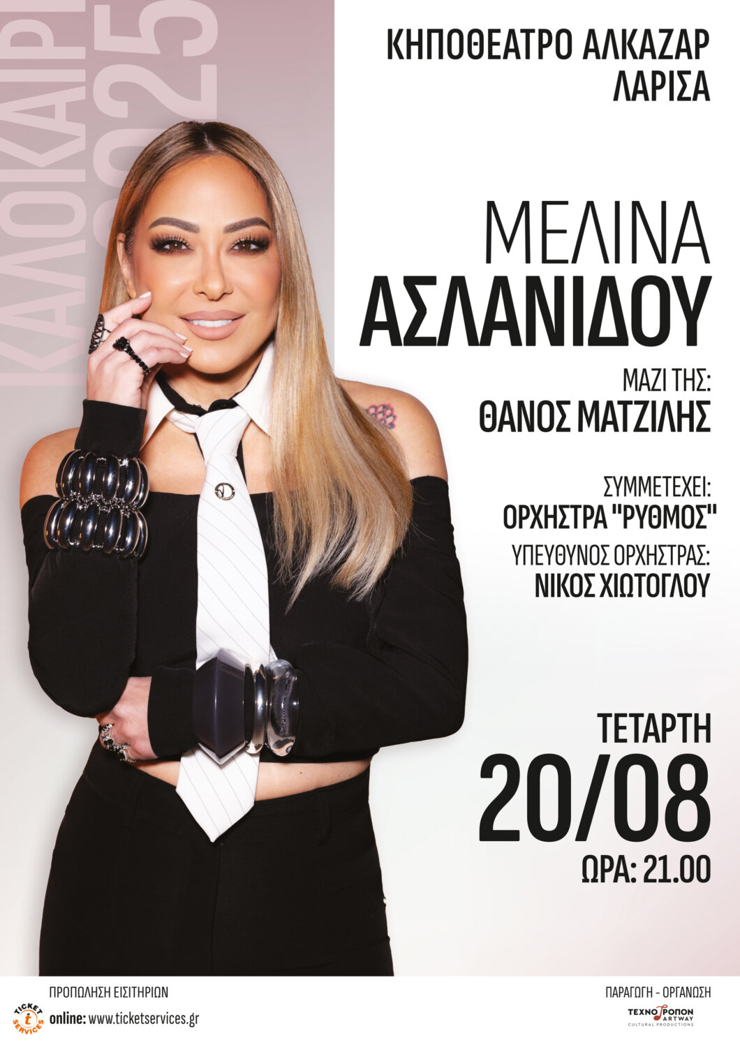 Η Μελίνα Ασλανίδου, μια από τις κορυφαίες ερμηνεύτριες του έντεχνου και λαϊκού τραγουδιού, θα κάνει μια στάση στο Κηποθέατρο Αλκαζάρ στη Λάρισα, στο πρόγραμμα της πολύ επιτυχημένης περιοδείας της στην Ελλάδα και στην Κύπρο, την Τετάρτη 20 Αυγούστου.