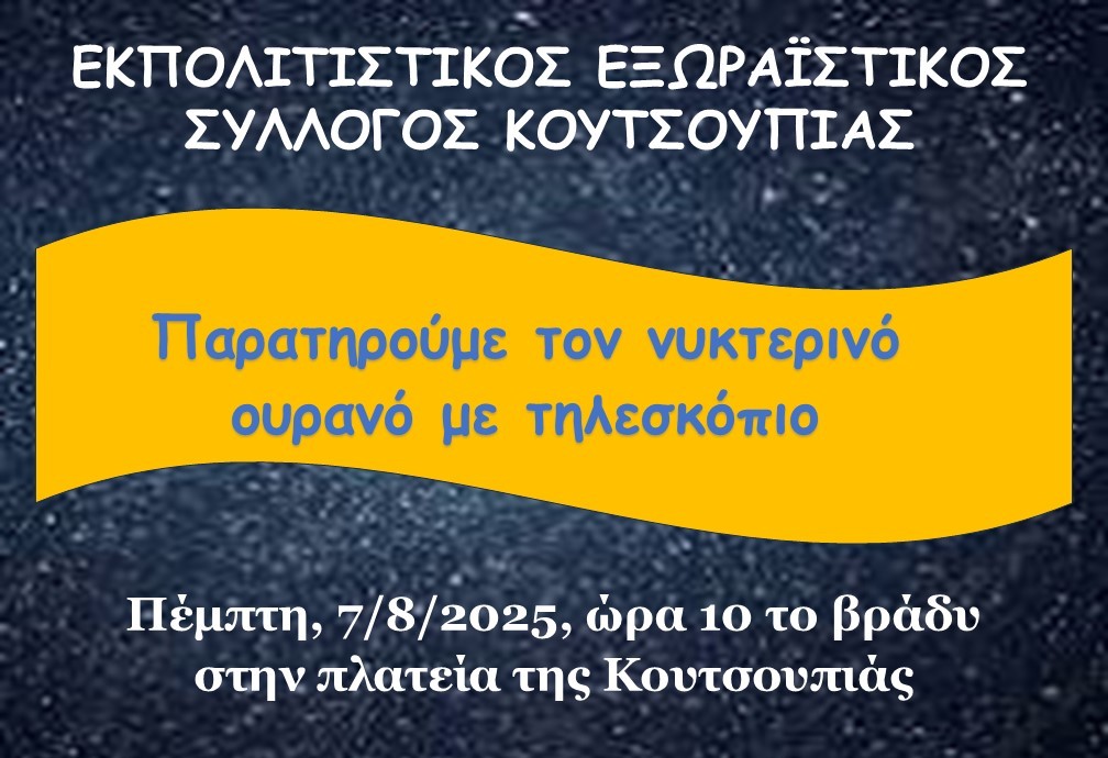 Ο Πολιτιστικός Σύλλογος Κουτσουπιάς σε συνεργασία με τον Δήμο Αγιάς και με την Εταιρεία Αστρονομίας και Διαστήματος με έδρα το Βόλο προσκαλεί τους/τις φίλους/ες του συλλόγου και τους επισκέπτες της Κουτσουπιάς την Πέμπτη 7 Αυγούστου και ώρα 10 το βράδυ σε μια αξέχαστη εμπειρία παρατήρησης του νυκτερινού ουρανού με τηλεσκόπιο.