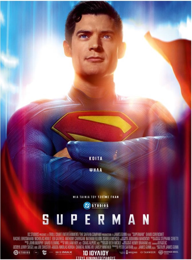 Περίληψη: O “Superman”, η πρώτη κινηματογραφική ταινία των DC Studios ετοιμάζεται να πετάξει στις αίθουσες αυτό το καλοκαίρι από τη Warner Bros. Pictures. Ο Τζέιμς Γκαν προσεγγίζει τον πρωτότυπο υπερήρωα με το χαρακτηριστικό του στυλ στο νέο σύμπαν της DC, συνδυάζοντας μοναδικά την επική δράση, το χιούμορ και τη συγκίνηση με έναν Superman που συναισθάνεται και πιστεύει ακλόνητα στην καλοσύνη των ανθρώπων.