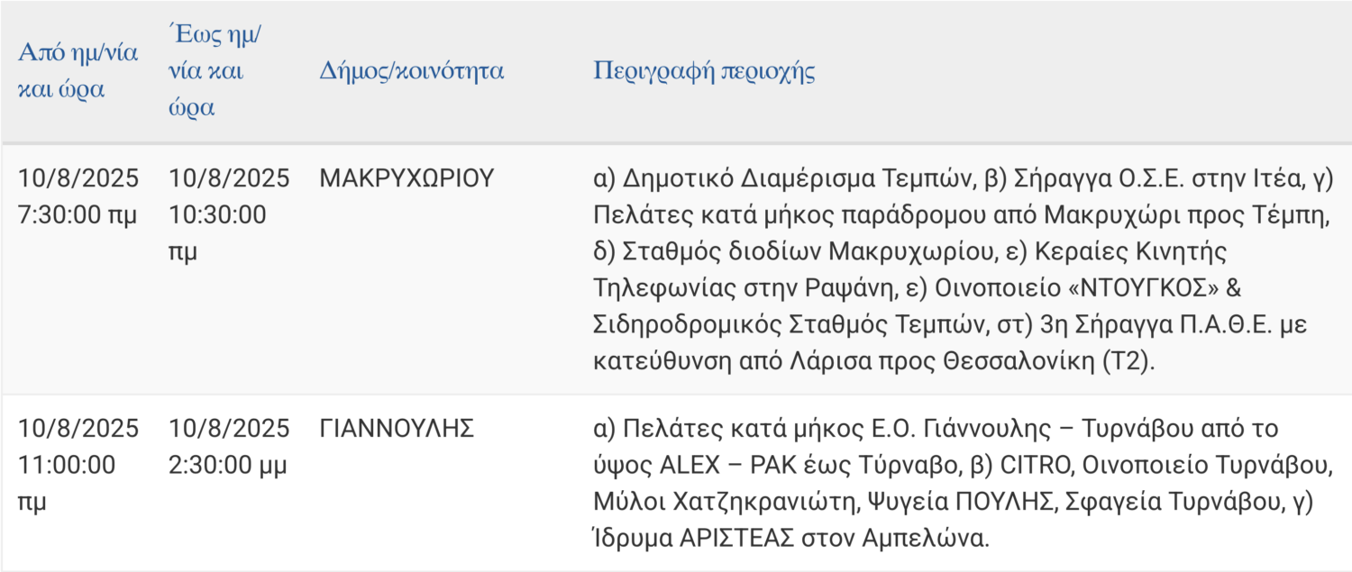 Σε προγραμματισμένες διακοπές στην παροχή ηλεκτρικού ρεύματος σε περιοχές της Περιφερειακής Ενότητας Λάρισα θα προχωρήσει την Κυριακή 10 Αυγούστου 2025 ο ΔΕΔΔΗΕ Α.Ε.