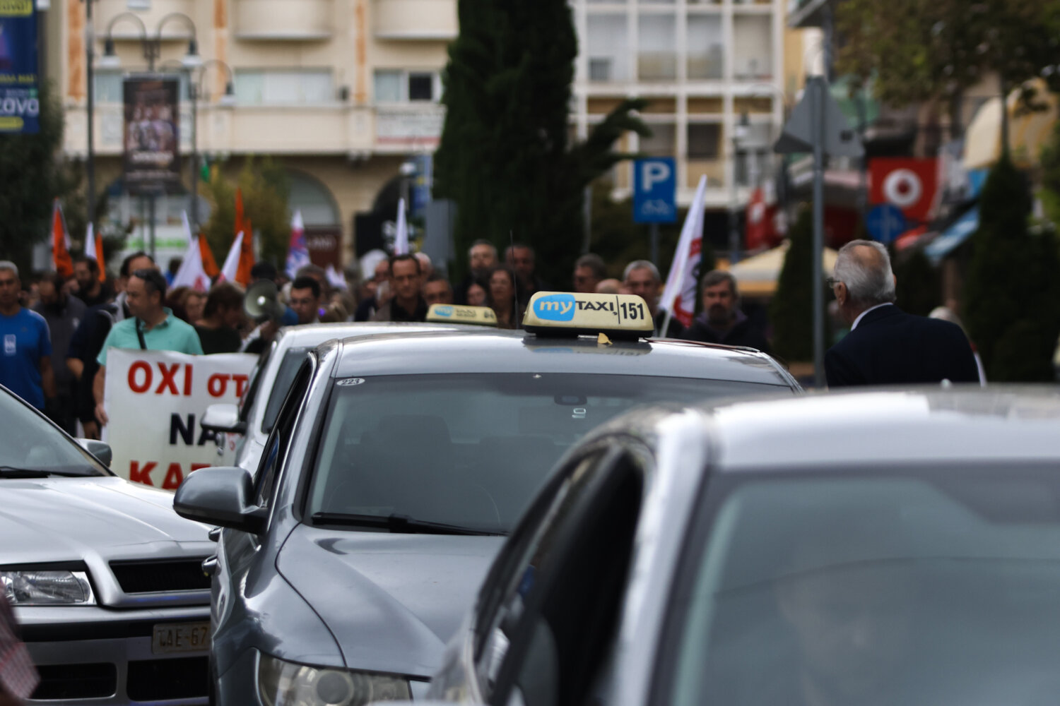 Συνάμα, στην πορεία έλαβαν μέρος και οδηγοί ταξί με τα οχήματά τους.