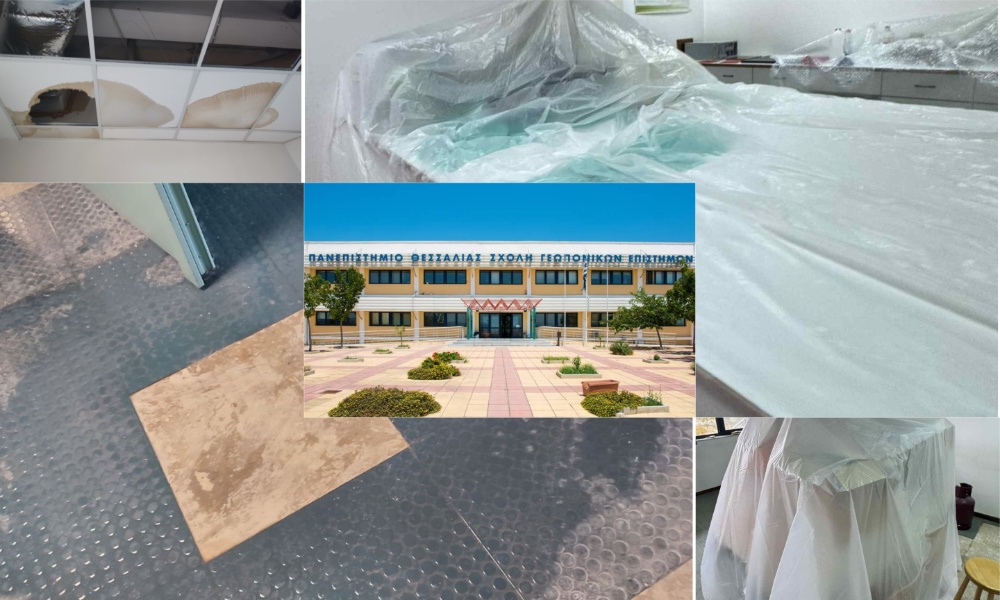 Την ώρα που το σύνθημα της κυβέρνησης είναι Ελλάδα 2.0, με έργα και υποδομές ανάπτυξης, οι φοιτητές και οι καθηγητές της Γεωπονικής Σχολής του Πανεπιστημίου Θεσσαλίας κάνουν μάθημα μέσα σε αίθουσες με κουβάδες για να συγκρατούν το νερό της βροχής, ενώ εξοπλισμοί χιλιάδων ευρώ είναι καλυμμένοι με πλαστικά για να μην βραχούν. «Είναι η τρίτη φορά μέσα σε πέντε μέρες, που πλημμυρίζουμε», είπε χαρακτηριστικά, μιλώντας στο Ράδιο ΕΝΑ και στον Ηλία Κουτσερή, ο Νίκος Νεαμονίτης, πρόεδρος του συμβουλίου φοιτητών του Πανεπιστημίου Θεσσαλίας και αντιπρόεδρος στον φοιτητικό σύλλογο του τμήματος Φυτικής Παραγωγής και Αγροτικού Περιβάλλοντος.