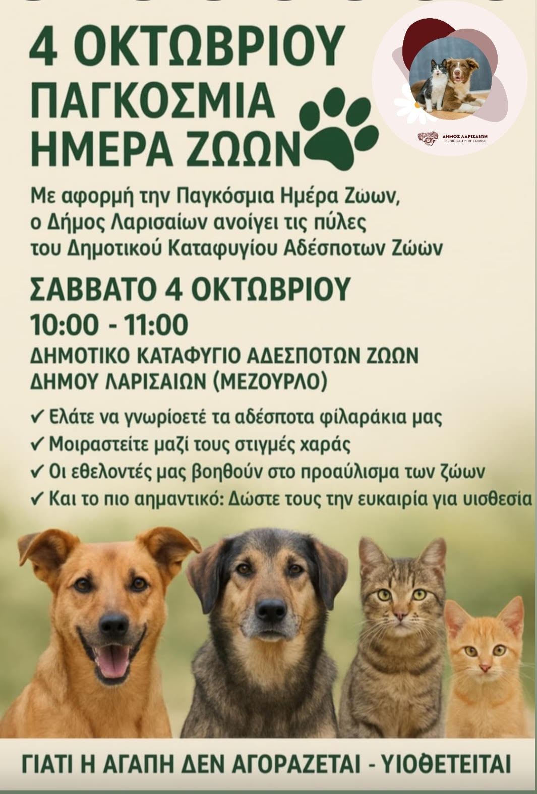 Το Σάββατο 4 Οκτωβρίου το Δημοτικό Καταφύγιο Αδέσποτων Ζώων Δήμου Λαρισαίων «ανοίγει τις πόρτες και σας περιμένουμε.